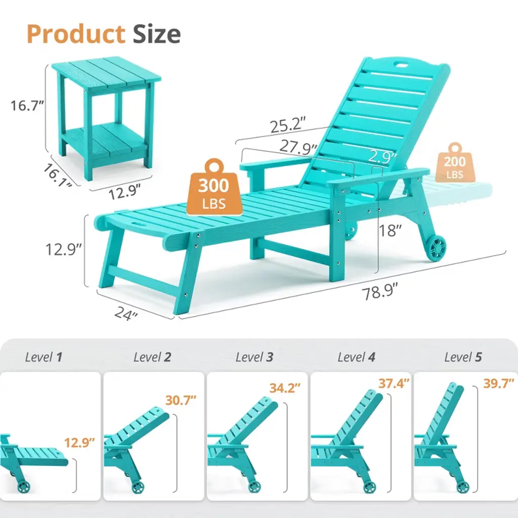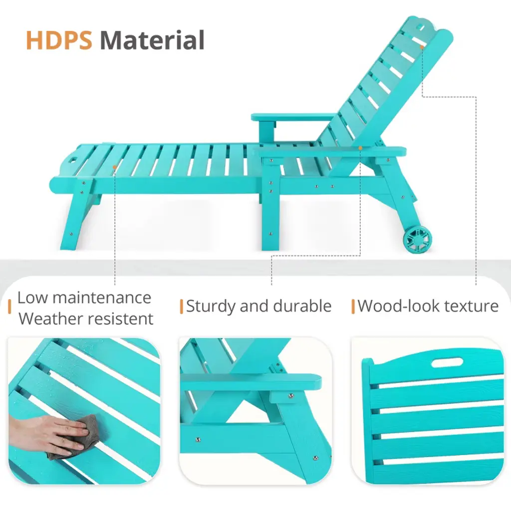 5-Position Adjustable Backrest ¨C This chaise lounge features a 5-position reclining mechanism, perfect for reading, napping, listening to music, or simply relaxing in total comfort. Effortless Mobility ¨C Smooth-rolling wheels allow you to easily move the lounge chair to your preferred spot¡ªby the pool, on the beach, in the backyard, or garden¡ªfor maximum outdoor enjoyment. Durable Build ¨C Constructed from high-quality HDPS (High-Density Polyethylene Synthetic) lumber, this outdoor lounge chair resists fading, cracking, and peeling, ensuring long-lasting performance in any weather. Quick & Easy Assembly ¨C No tools required! Set up in just 34 minutes with included hardware and straightforward instructions. Low-Maintenance Design ¨C Unlike traditional wood or metal loungers, the chaise requires no sealing or special care. Its easy-to-clean surface lets you spend more time relaxing and less time maintaining.