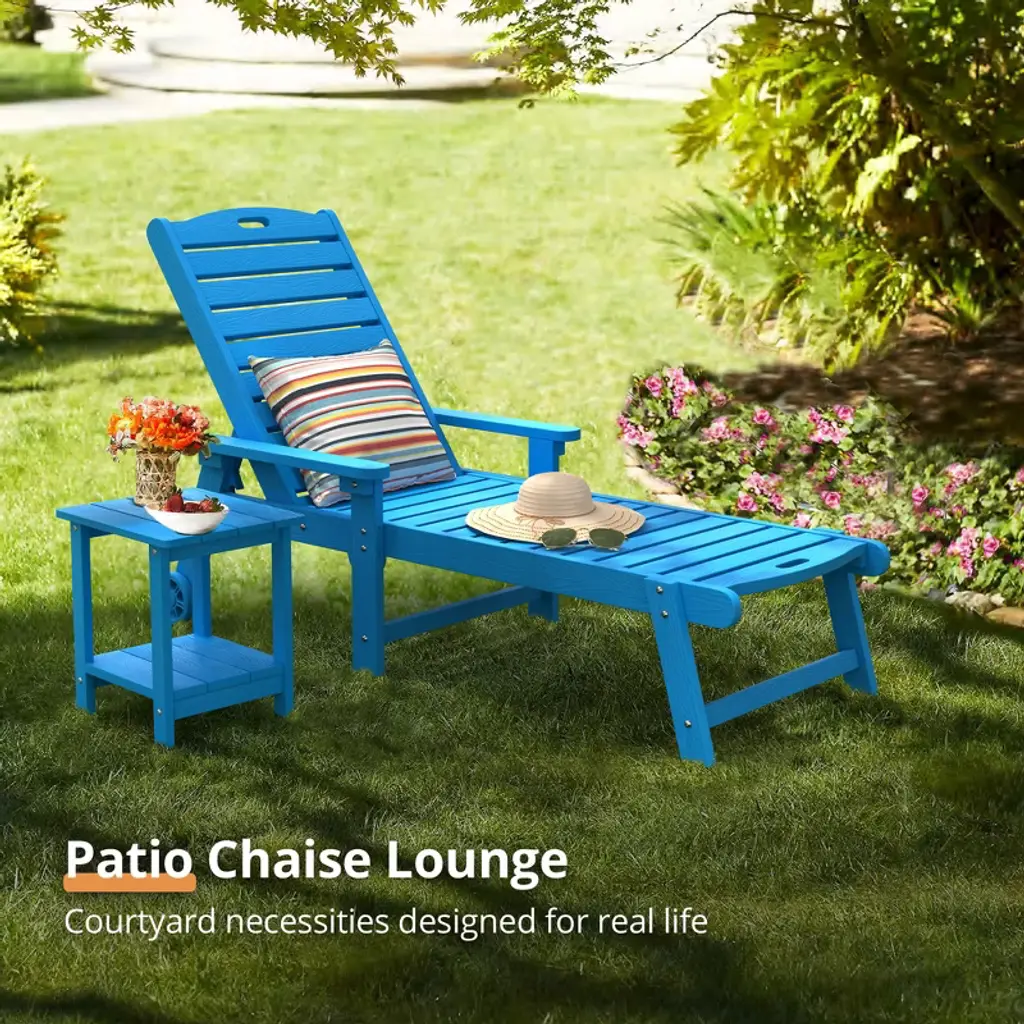 5-Position Adjustable Backrest ¨C This chaise lounge features a 5-position reclining mechanism, perfect for reading, napping, listening to music, or simply relaxing in total comfort. Effortless Mobility ¨C Smooth-rolling wheels allow you to easily move the lounge chair to your preferred spot¡ªby the pool, on the beach, in the backyard, or garden¡ªfor maximum outdoor enjoyment. Durable Build ¨C Constructed from high-quality HDPS (High-Density Polyethylene Synthetic) lumber, this outdoor lounge chair resists fading, cracking, and peeling, ensuring long-lasting performance in any weather. Quick & Easy Assembly ¨C No tools required! Set up in just 35 minutes with included hardware and straightforward instructions. Low-Maintenance Design ¨C Unlike traditional wood or metal loungers, the chaise requires no sealing or special care. Its easy-to-clean surface lets you spend more time relaxing and less time maintaining.