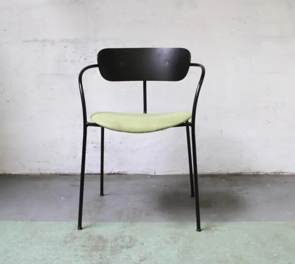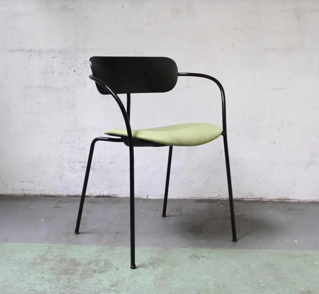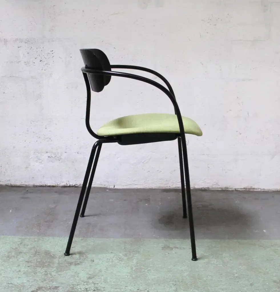 Design chair Pavilion AV4 by Anderss & Voll for & Tradition. Black tinted metal structure, with black tinted wooden backrest and padded -upholstered lounge. 45cm seat height. Perfect for all your home or office space. This piece has an attribution mark, I am sure that it is completely authentic and take full responsibility for any authenticity issues arising from misattribution