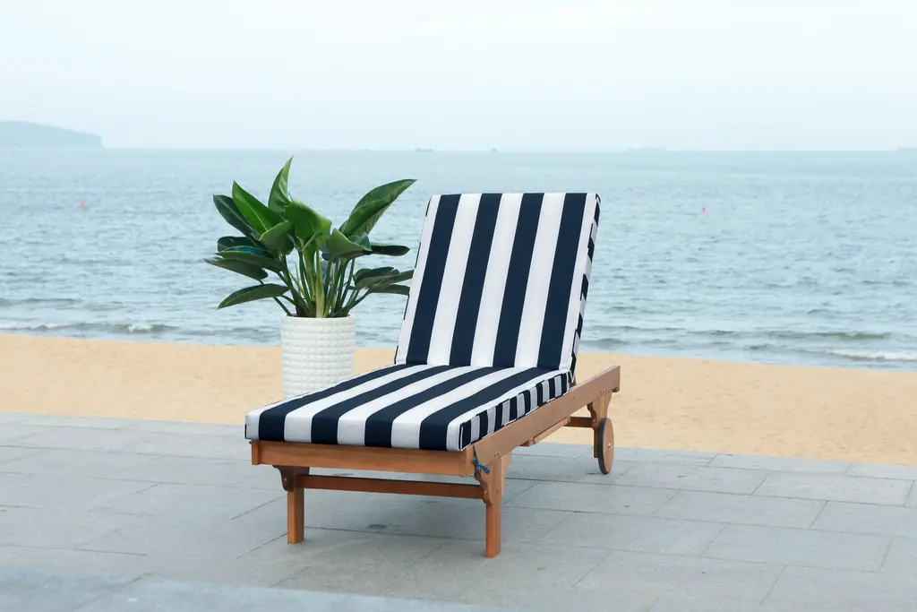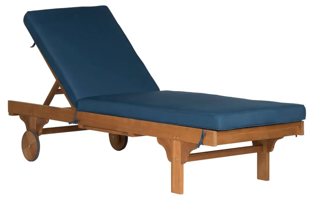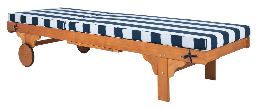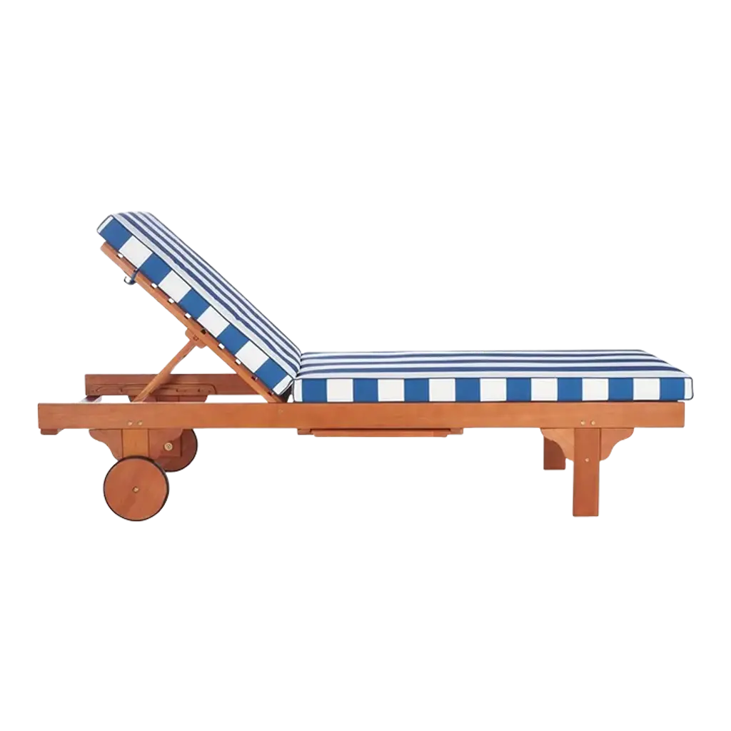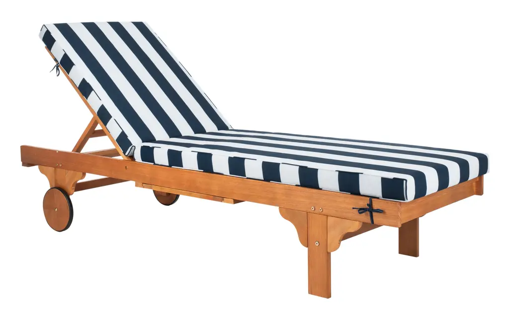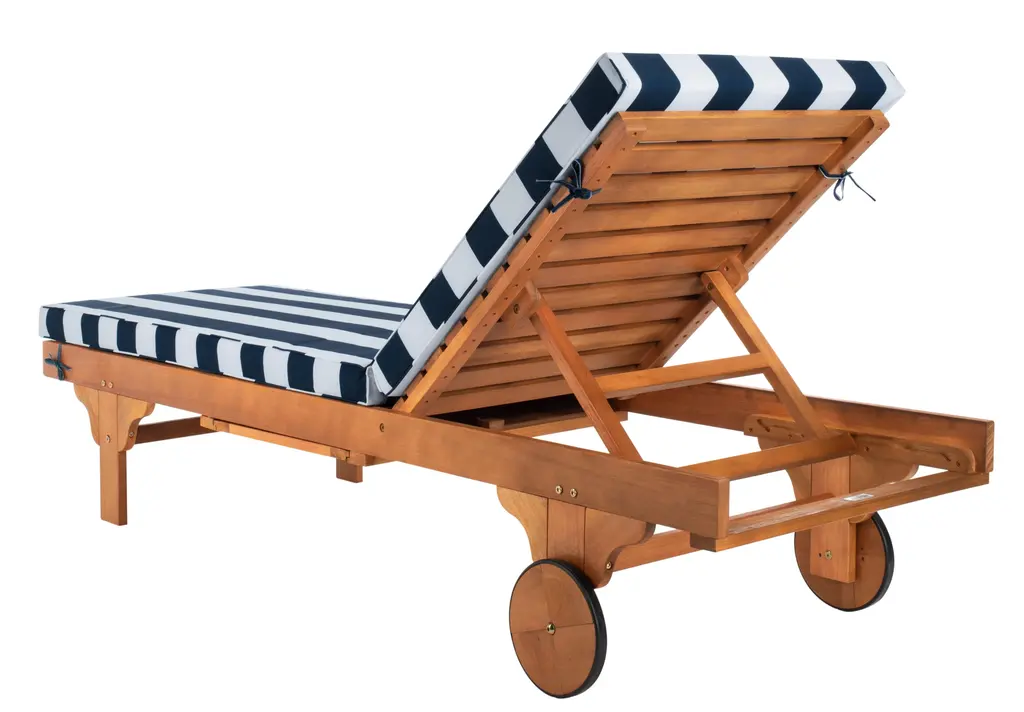 A fresh update of a of a English garden classic, the outdoor chaise lounge chair recalls the manicured landscapes of Rhode Island seaside mansions. Crafted with beige fabric and natural finish on eucalyptus wood with back wheels for easy mobility, and a sliding table for your refreshing drinks. Store outdoor furniture indoors or cover well when not in use. Remove wooden furniture from standing water. Dust regularly with small brush or vacuum. Spills should be taken care of immediately before they harden or stain with a slightly dampened sponge. Do not use bleach solutions. Some assembly required.