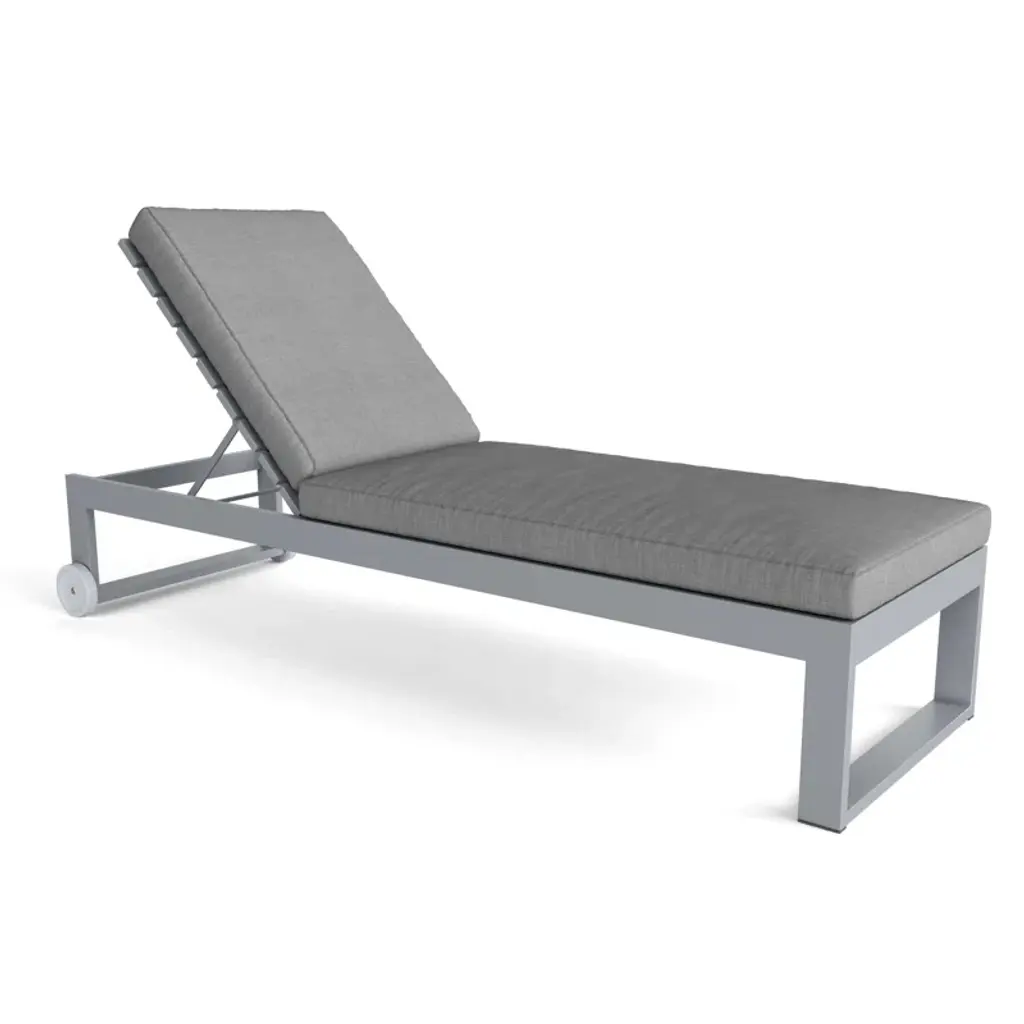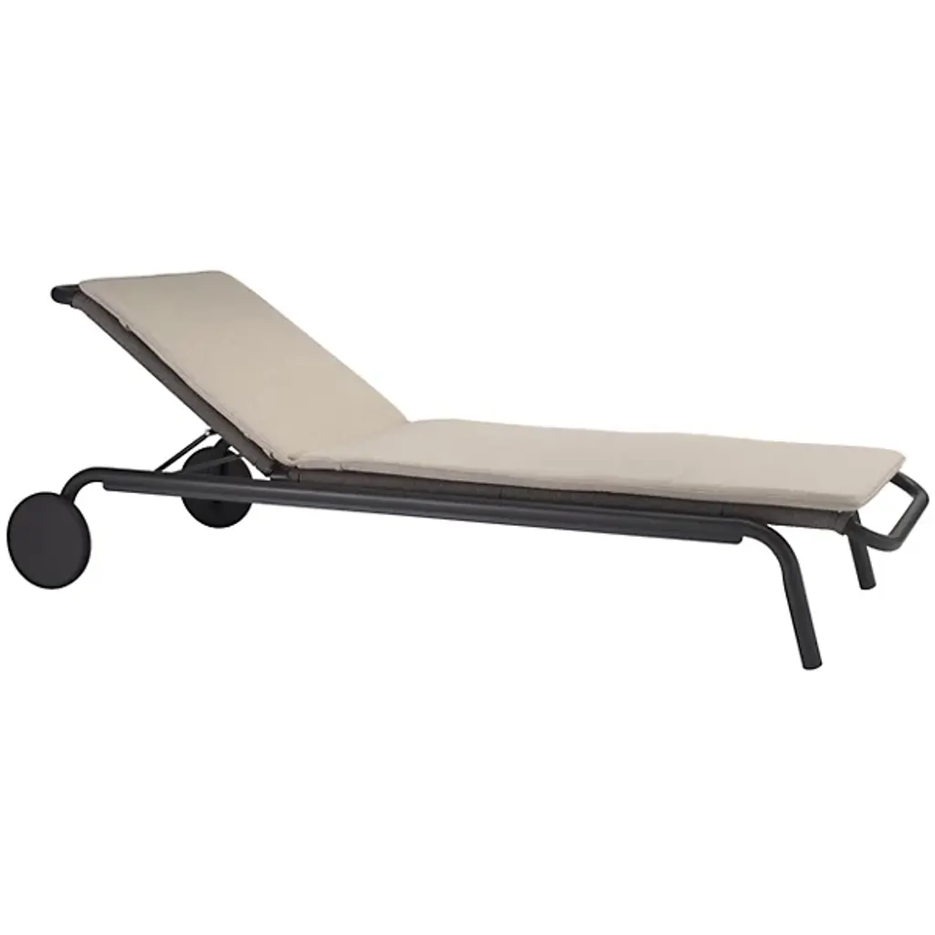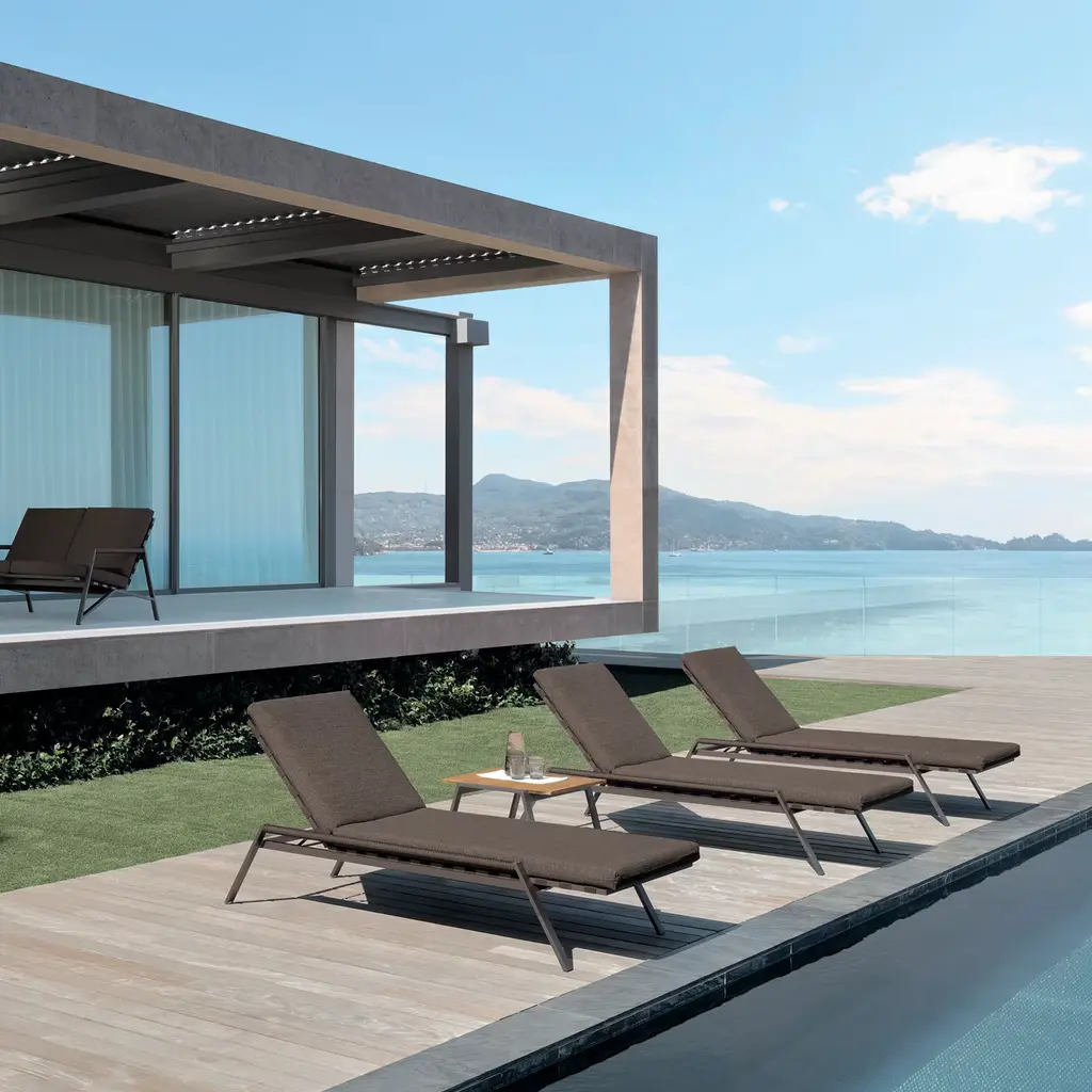 The modern aesthetic and simple lines of this sunbed will bring a refined style and welcoming look to a rustic or contemporary outdoor. Stackable for easy storage thanks to the slanted legs and linear structure, this sunbed has a mocha powder-coated aluminum frame, with seat and reclining back supported by elastic straps. Paired with soft cushions in brown fabric, the quick dry padding is ideal for pools, as it is weather and moisture resistant.