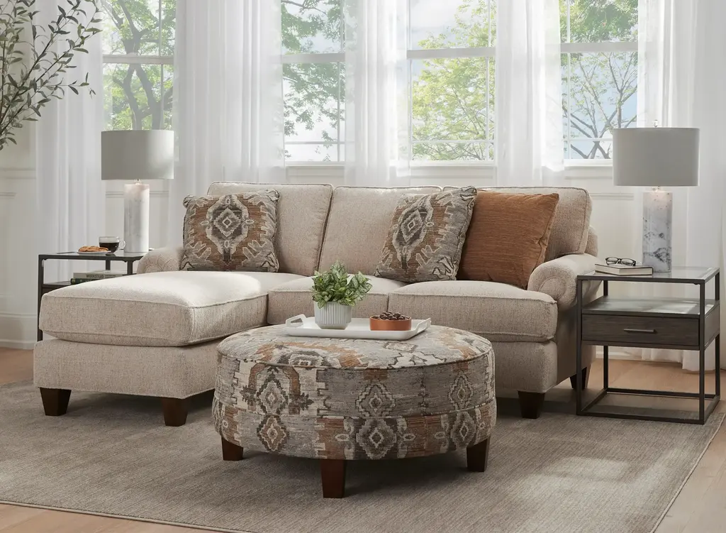 A classic silhouette is the cornerstone of the Crestwood left arm-facing chaise, just one terrific component of the collection's sectional options. Plush textured chenille upholstery wraps around this plump yet tailored design, while the rolled arm style beckons you to sit and relax. An ikat-inspired accent pillow adds dimension and subtle pizzaz to a transitional look that promises to create a cozy and casual vibe for a family room everyone can enjoy.