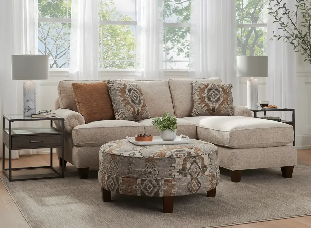 A classic silhouette is the cornerstone of the Crestwood right arm-facing chaise, just one terrific component of the collection's sectional options. Plush textured chenille upholstery wraps around this plump yet tailored design, while the rolled arm style beckons you to sit and relax. An ikat-inspired accent pillow adds dimension and subtle pizzaz to a transitional look that promises to create a cozy and casual vibe for a family room everyone can enjoy.
