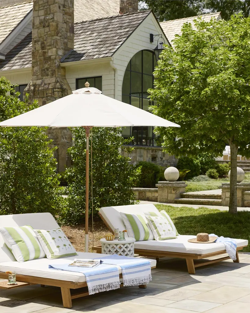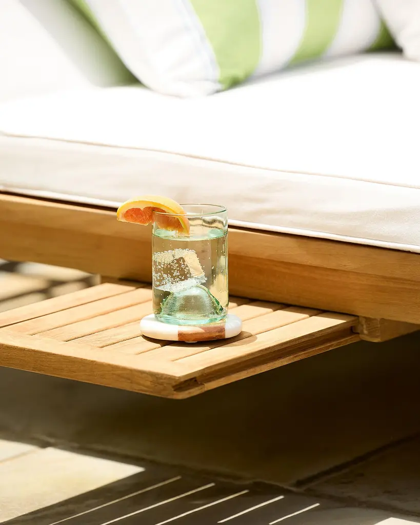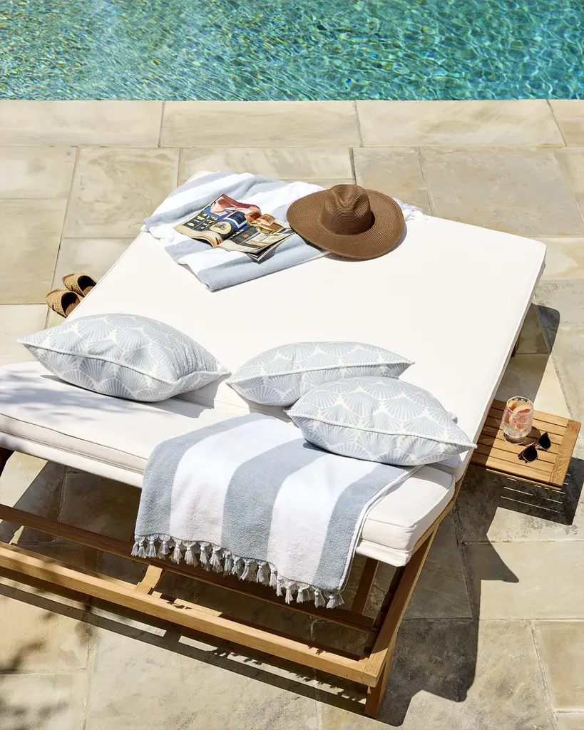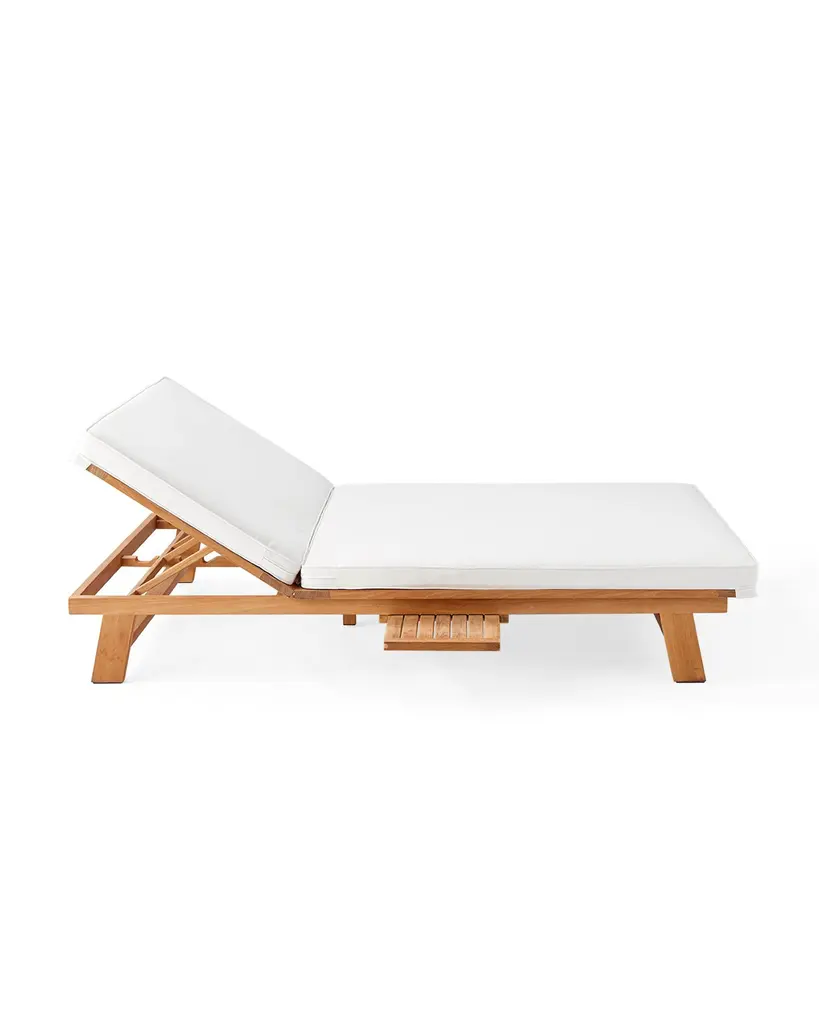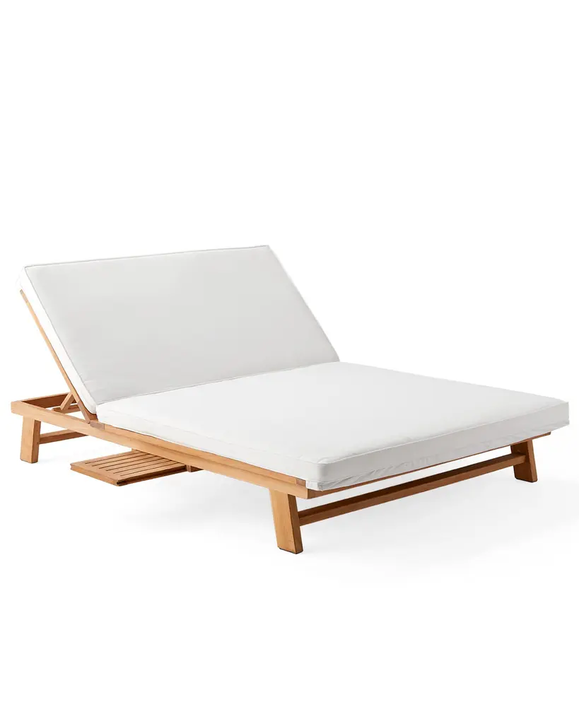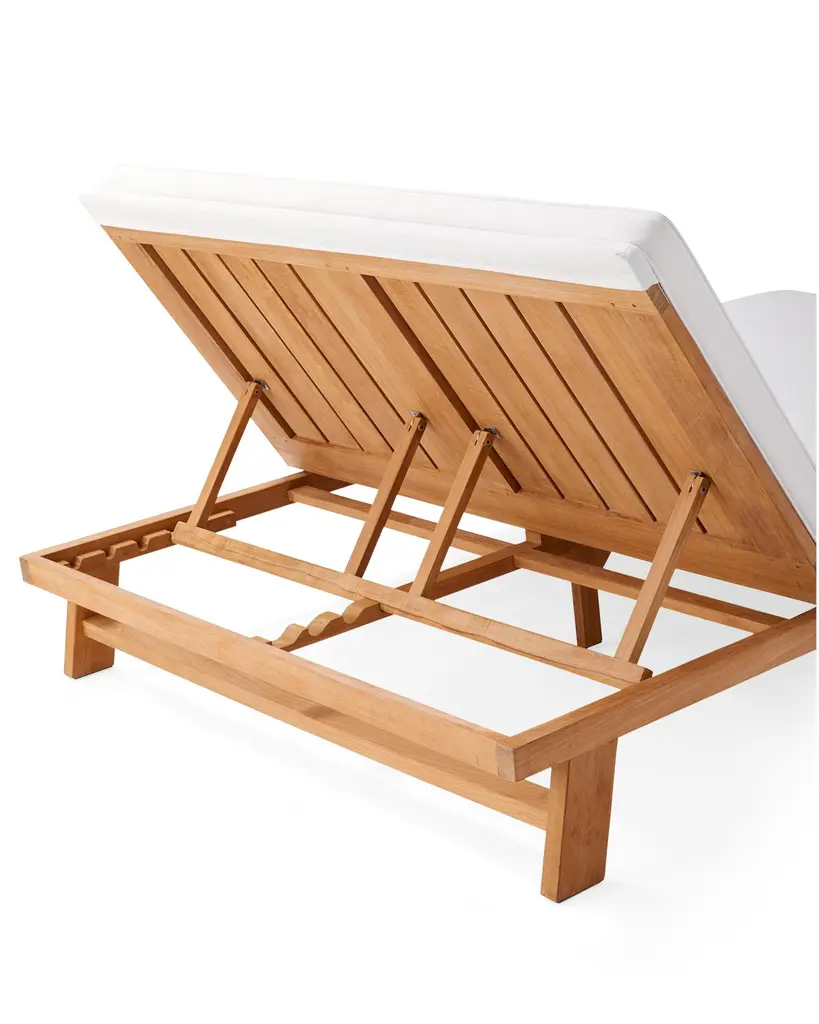 The sun-warmed splendor of this sustainably-sourced Grade A Teak form earns a silvery patina in time. Innately resistant to the elements. Adorned with bounce-back cushions constructed for comfort, support, and longevity. Covered in performance fabric. The chaise features room for two, four reclining positions, and a pull-out tray for books or cocktails.