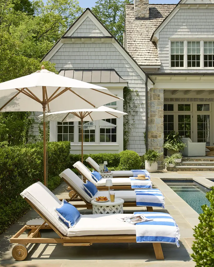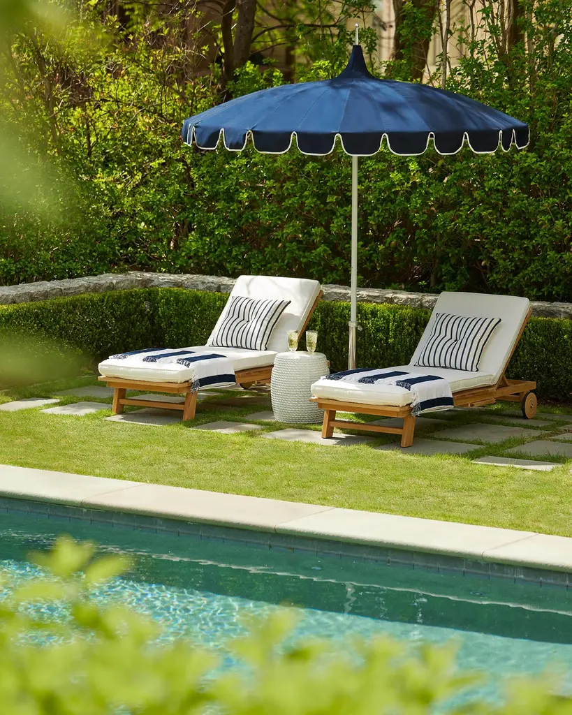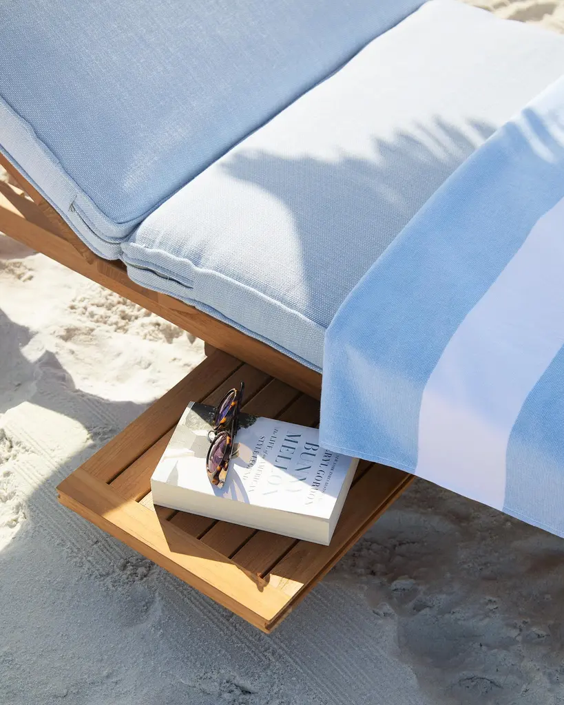The sun-warmed splendor of this sustainably-sourced Grade A Teak form earns a silvery patina in time. Innately resistant to the elements. Adorned with bounce-back cushions constructed for comfort, support, and longevity. Covered in performance fabric. The chaise features four reclining positions, a pull-out tray for a book or cocktail, and back wheels to retreat to the shade.