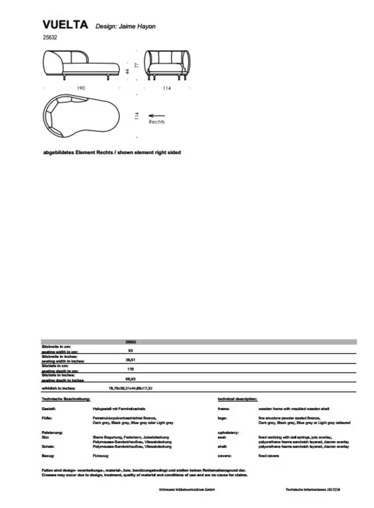My private island: a classic free-standing chaise lounge is always something of a private retreat, even when it is part of a larger ensemble. Vuelta’s sensual lines have found a logical progression in this chaise longue (W 190cm).The distinctive upholstery of the backrest that gives Vuelta its unmistakable character sweeps protectively around the headrest of this day bed, creating an island that can be shared – but need not be.