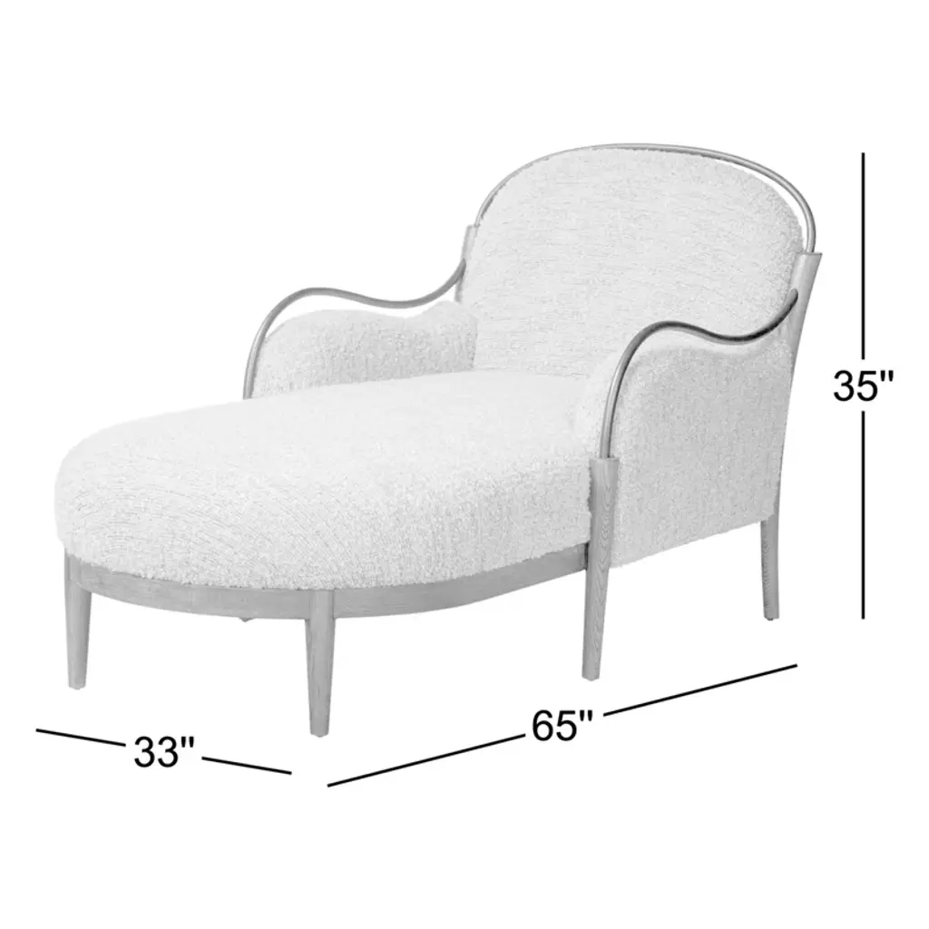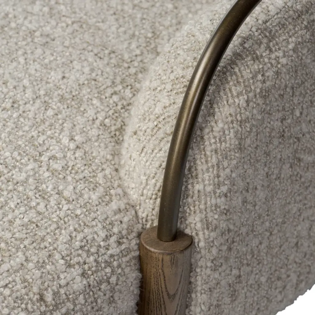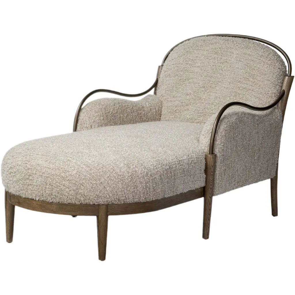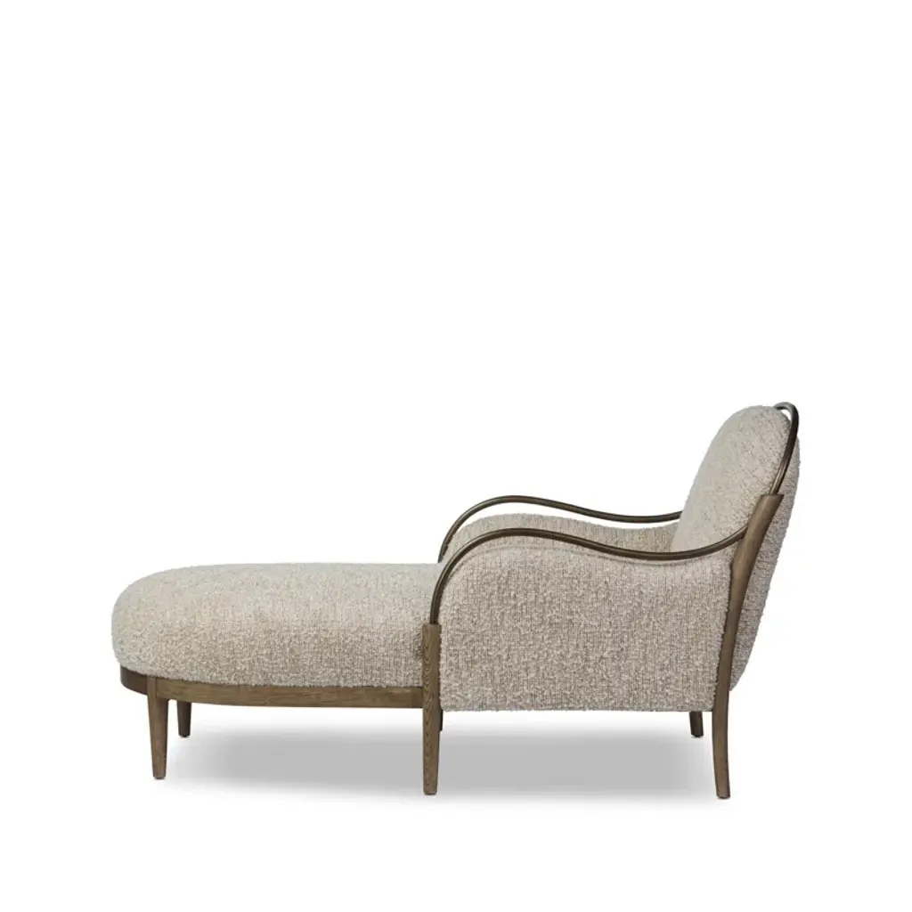 A tribute to traditional artistry and found pieces, this updated chaise silhouette fluidly combines ash and burnished brass to frame a comfortable S-spring seat. Finished in heavy boucle-like upholstery that features a subtle linear pattern for added depth — creating a luxe, inviting feel. A design collaboration by Amber Lewis and Four Hands.