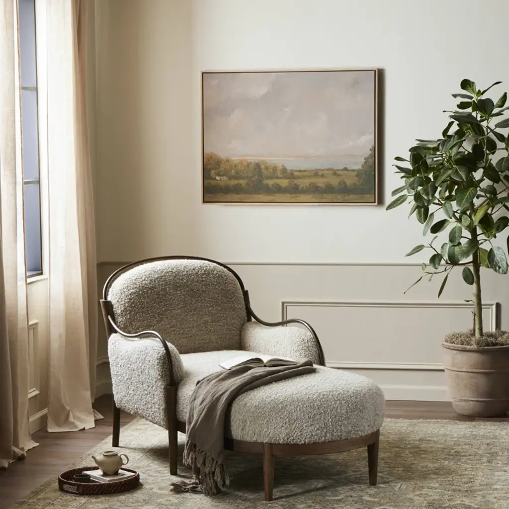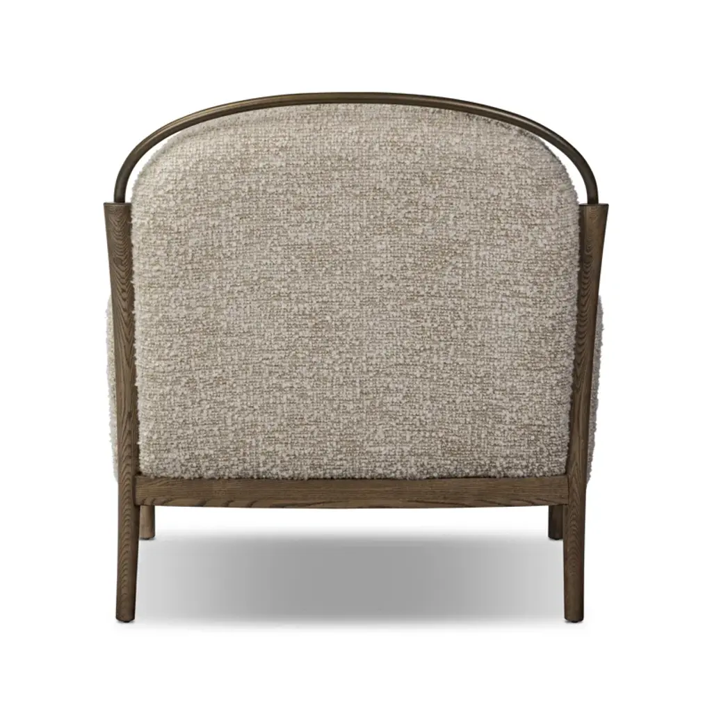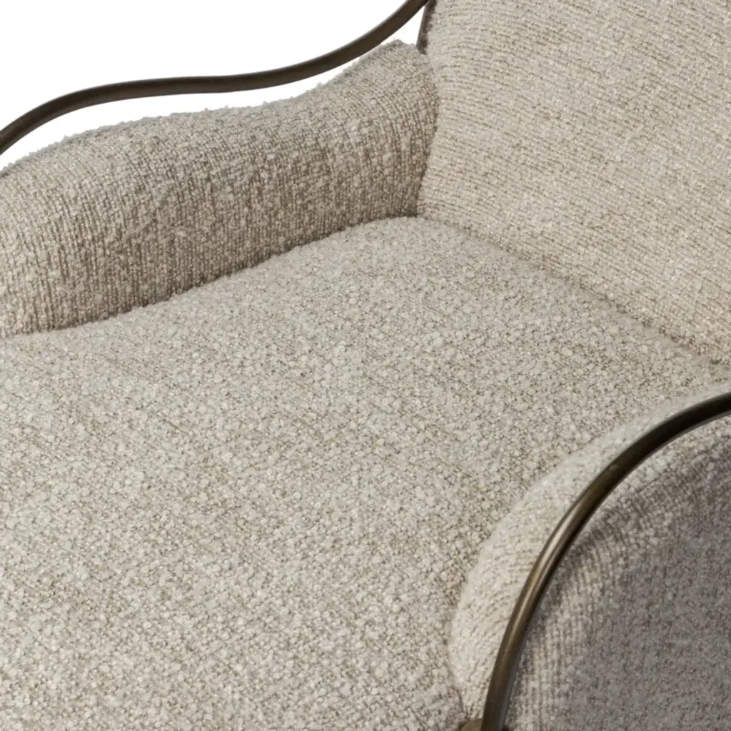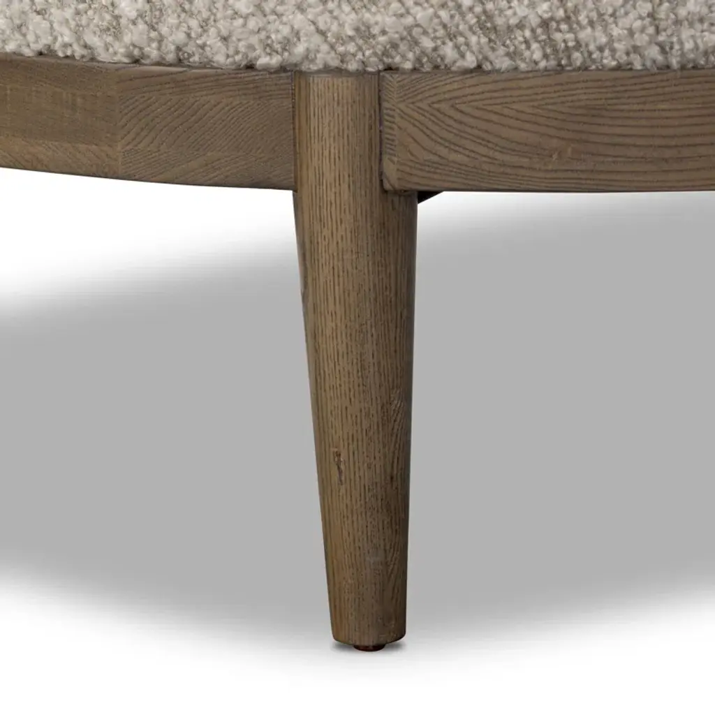 A tribute to traditional artistry and found pieces, this updated chaise silhouette fluidly combines ash and burnished brass to frame a comfortable S-spring seat. Finished in heavy boucle-like upholstery that features a subtle linear pattern for added depth — creating a luxe, inviting feel. A design collaboration by Amber Lewis and Four Hands.