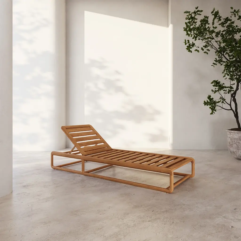 The Dock Chaise Lounge is designed for effortless outdoor relaxation, featuring a sleek teak frame with sculptural lines and an optional cushion. Its low-profile silhouette and open framework create an airy, modern aesthetic, while the reclining backrest allows for customizable comfort. Crafted for durability and style, the Dock Chaise is the perfect addition to poolside lounging or sunlit patios, offering a seamless blend of function and refined design.