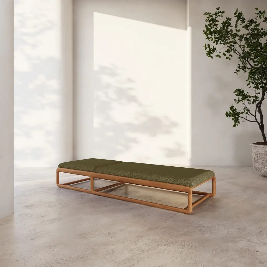 The Dock Chaise Lounge is designed for effortless outdoor relaxation, featuring a sleek teak frame with sculptural lines and an optional cushion. Its low-profile silhouette and open framework create an airy, modern aesthetic, while the reclining backrest allows for customizable comfort. Crafted for durability and style, the Dock Chaise is the perfect addition to poolside lounging or sunlit patios, offering a seamless blend of function and refined design.