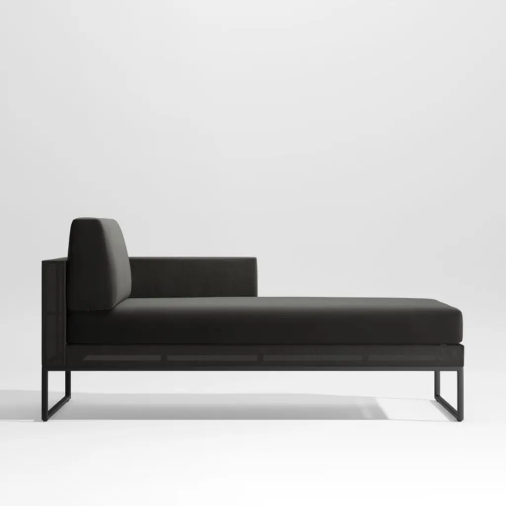Our urban-style Dune outdoor sectional collection forms the centerpiece of a truly modern "indoor room" that lives outdoors. Outdoor-grade aluminum constructs the right-arm chaise's crisp linear frame cloaked in black synthetic mesh that's resistant to fading, mold, tears and stains. Matching black cushions are neatly tailored in weather-resistant acrylic. The Dune outdoor sectional chaise with black cushions is a Crate & Barrel exclusive.