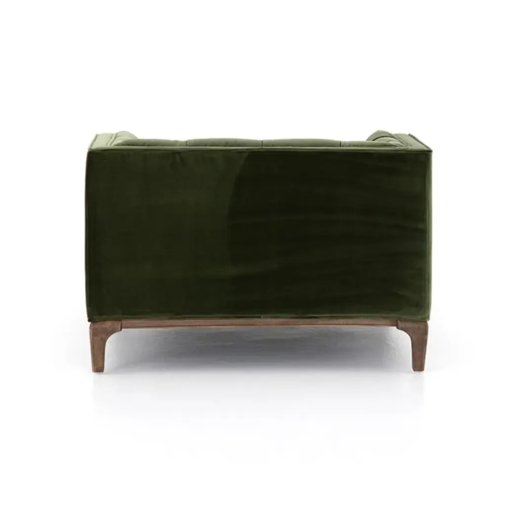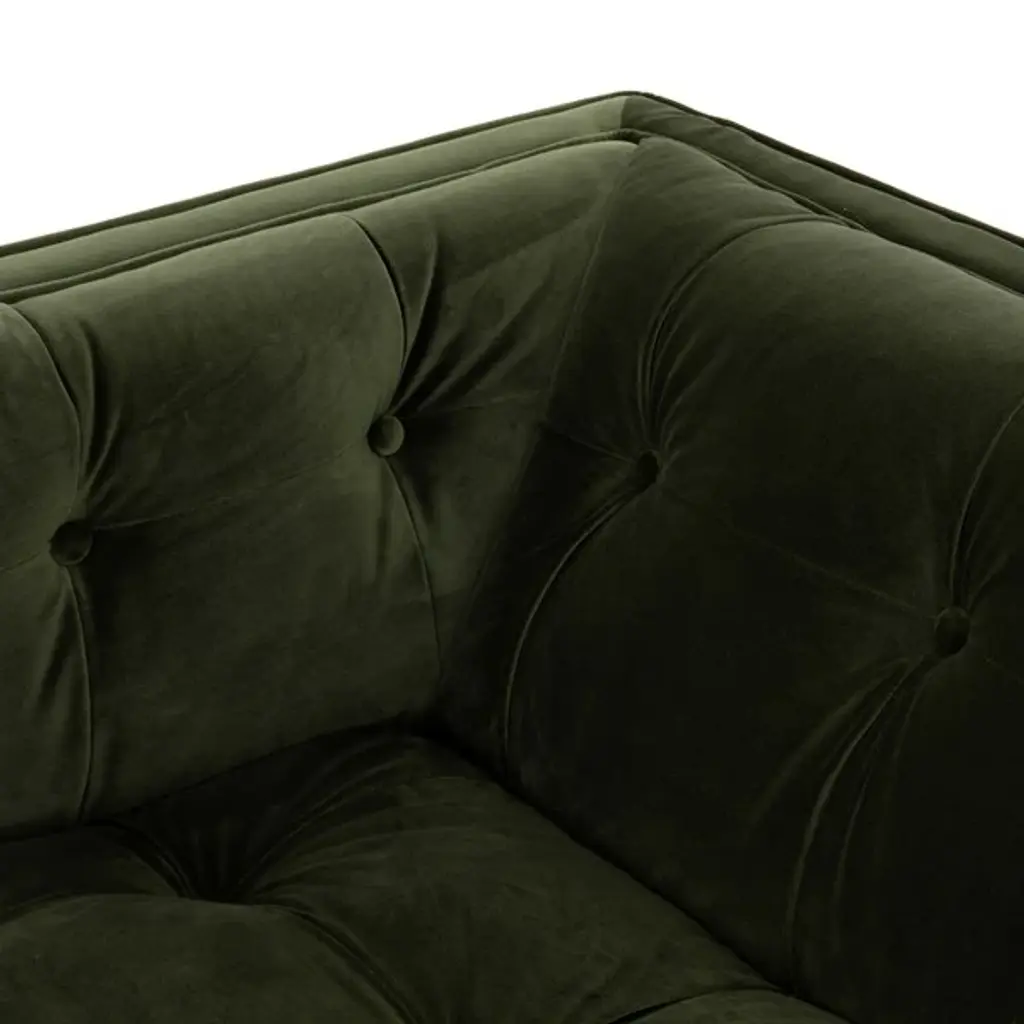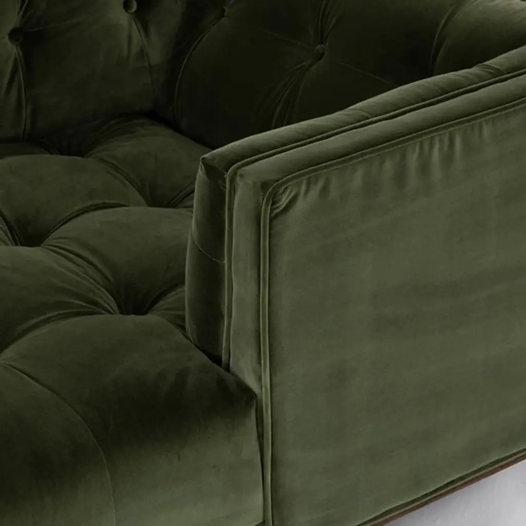 A low, tight mid-century silhouette features blind tufting and a solid parawood frame. Available in a luxurious green velvet.