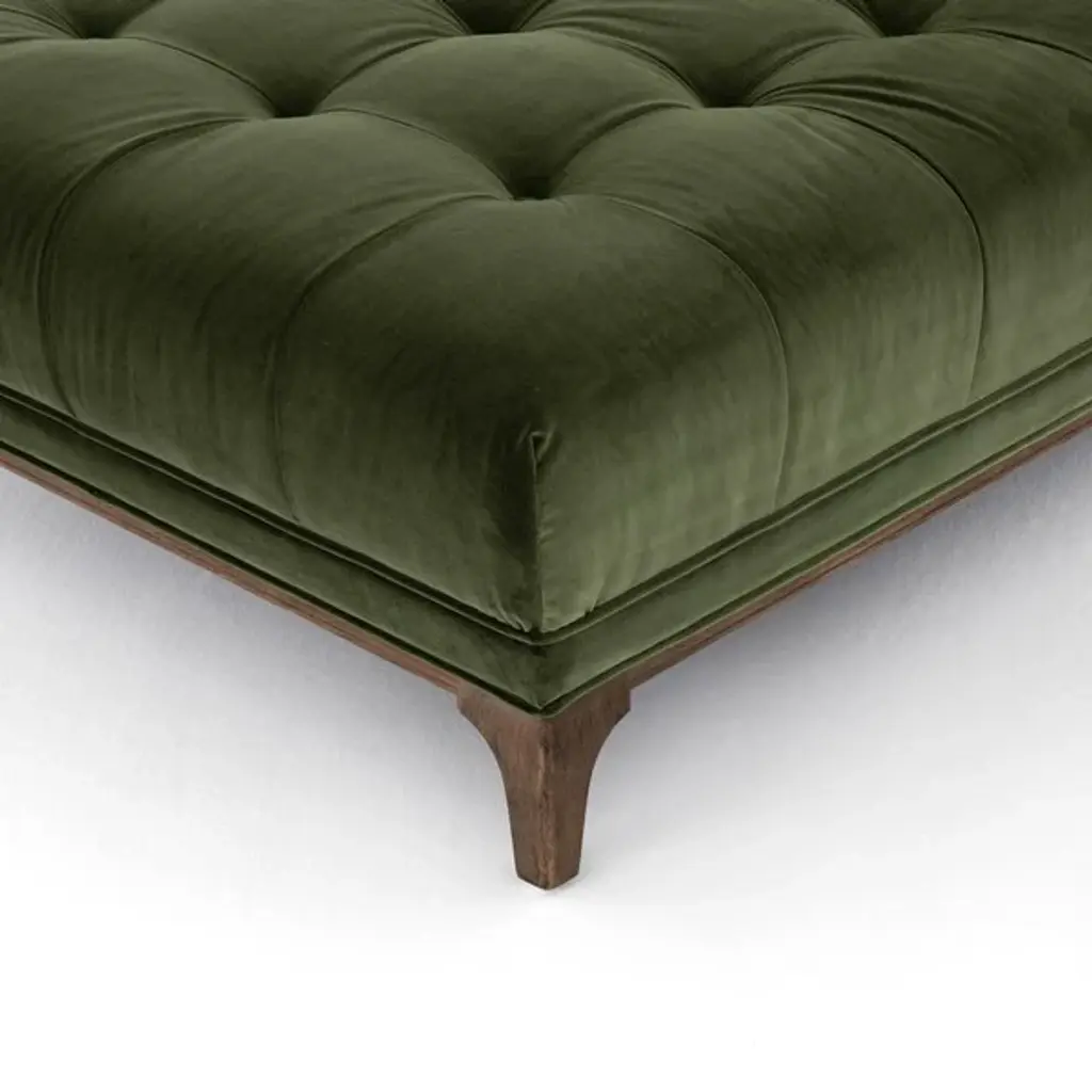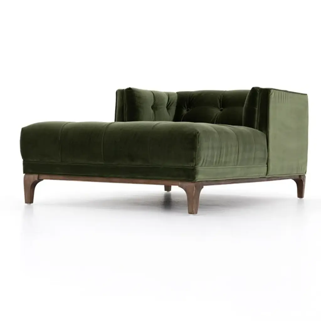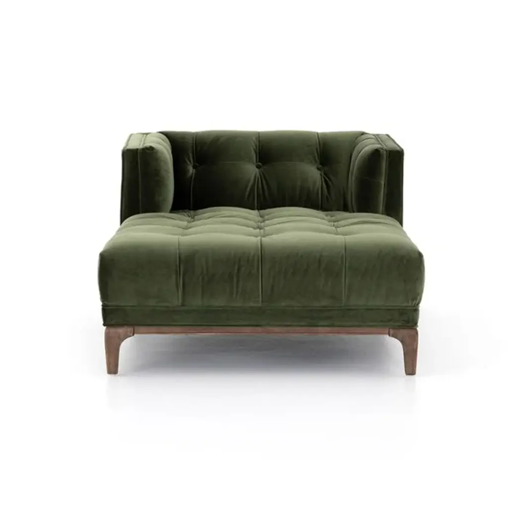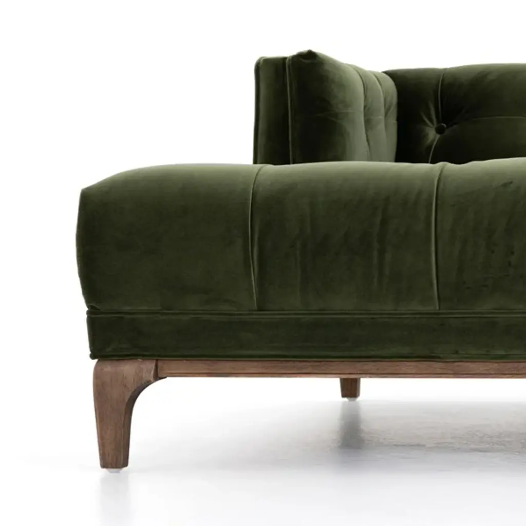 A low, tight mid-century silhouette features blind tufting and a solid parawood frame. Available in a luxurious green velvet.