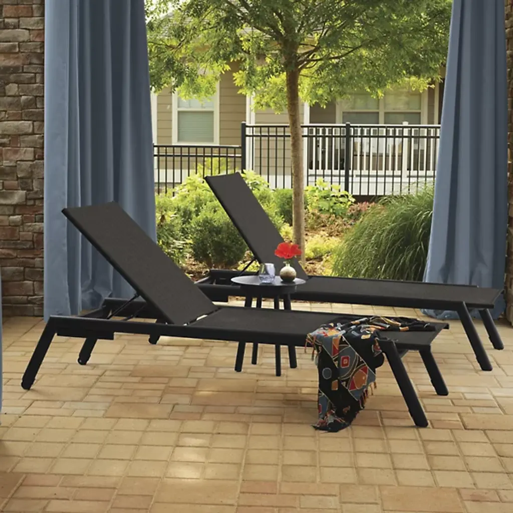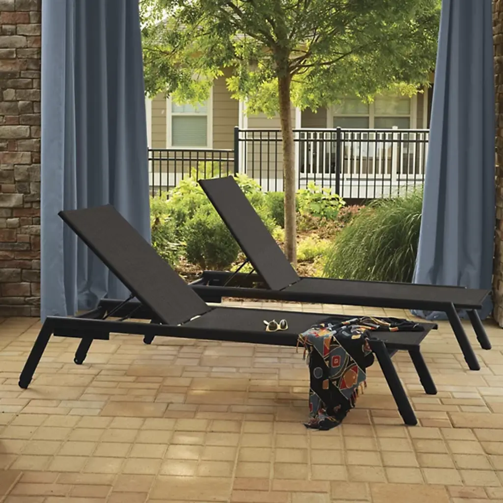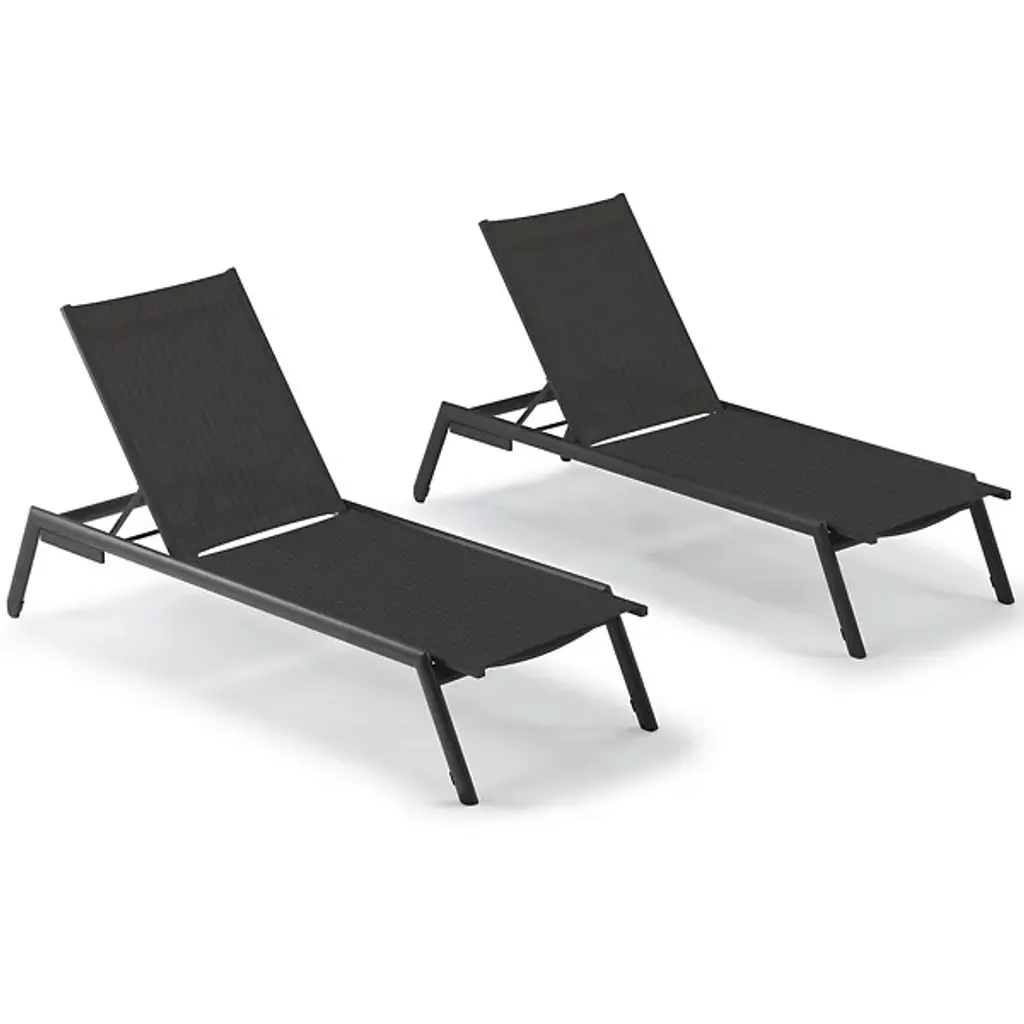Enjoy elegant, airy style poolside with the Eiland Armless Chaise Lounge - Ninja Sling - 2 pack by Oxford Garden. Each piece in this set starts with an angular aluminum frame covered in a durable powder coated finish. Across the base and back, a PVC-coated polyester mesh is durable and supportive as well as breathable. The adjustable back offers 4 positions, including completely flat, for customizable comfort. Petite wheels are discreetly housed in the front legs for easy movement.
