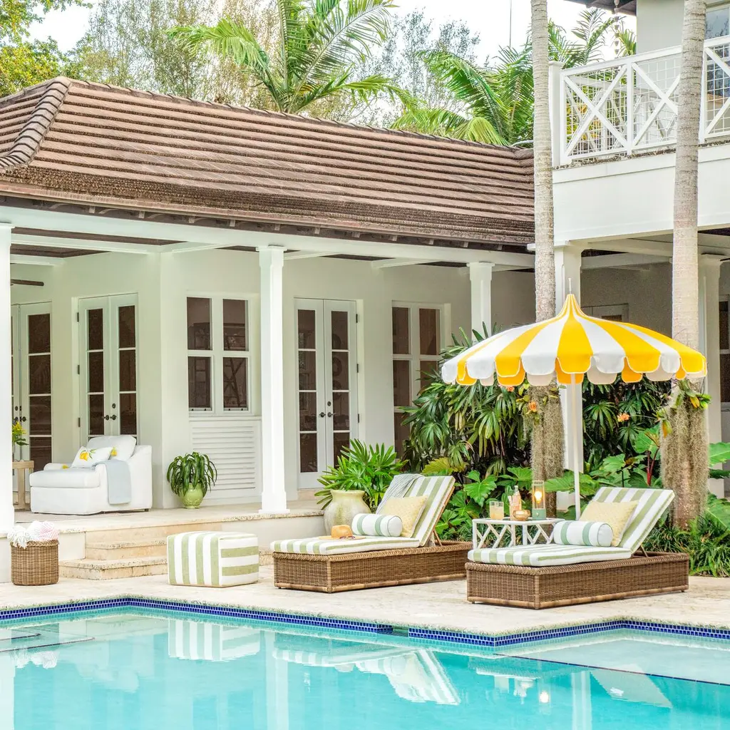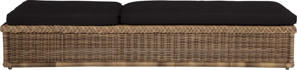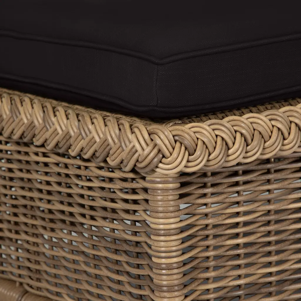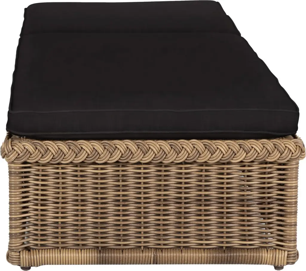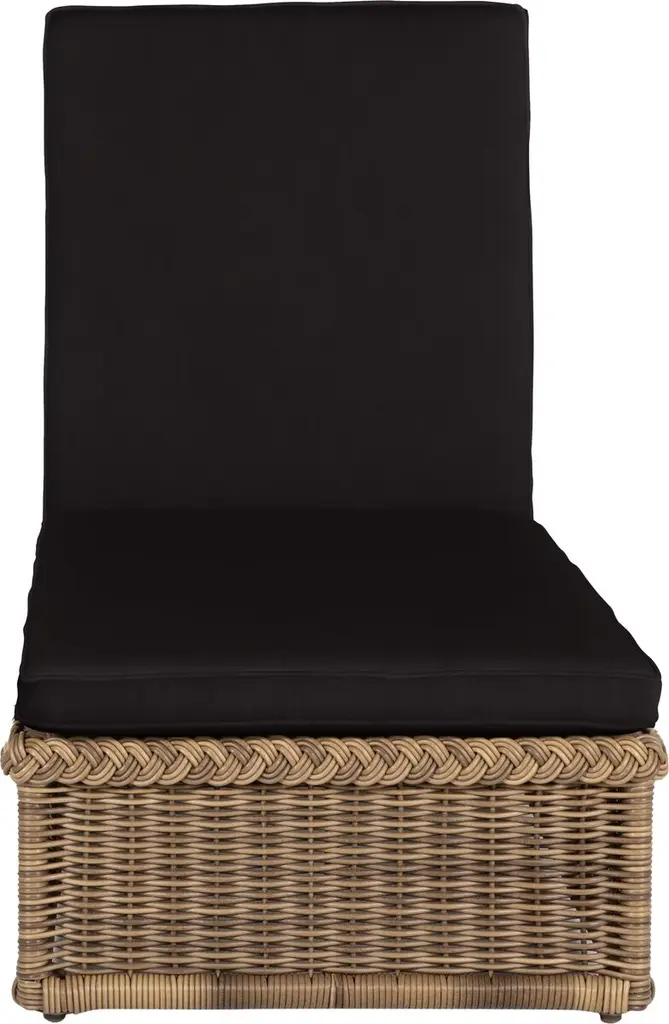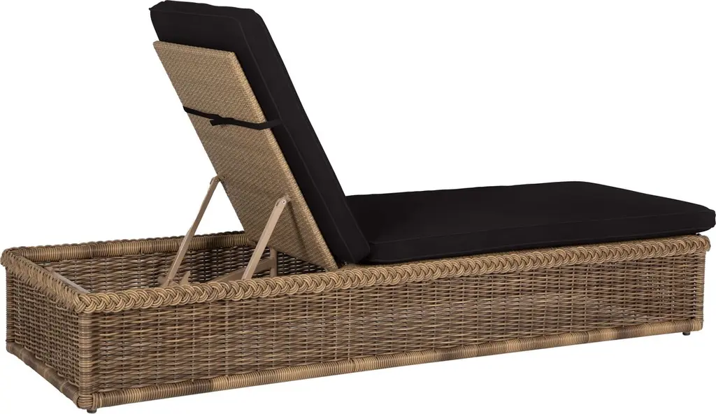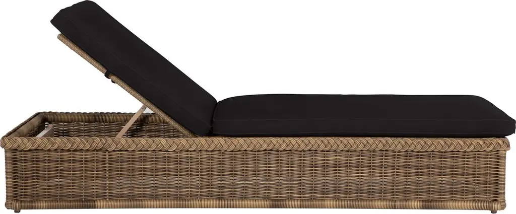 Designed by us and available only at One Kings Lane: The intricate braid detailing around the base is just one feature that makes this outdoor chaise a standout. The chaise also has an adjustable back for optimal comfort.Also of note: • N-dura resin wicker, which looks like natural rattan but is UV-resistant and impressively durable, is handwoven over equally long-lasting aluminum. • The cushions are covered in stain-resistant, mold-resistant, fade-resistant fabric.