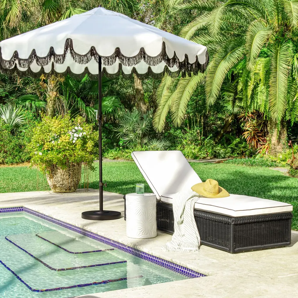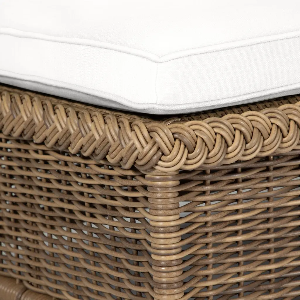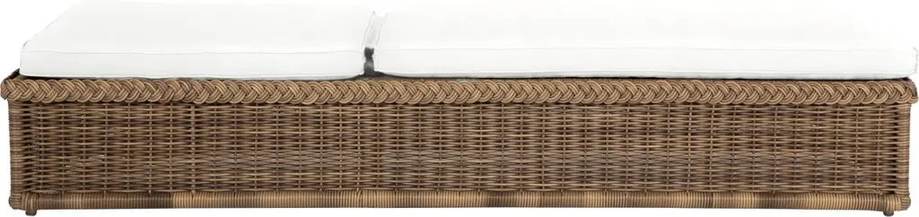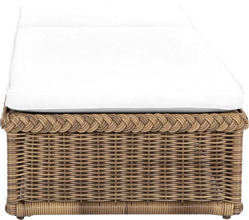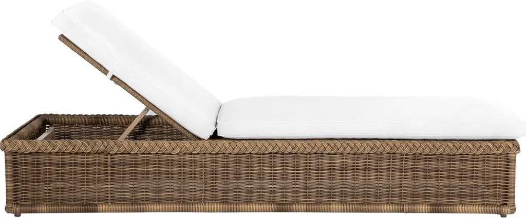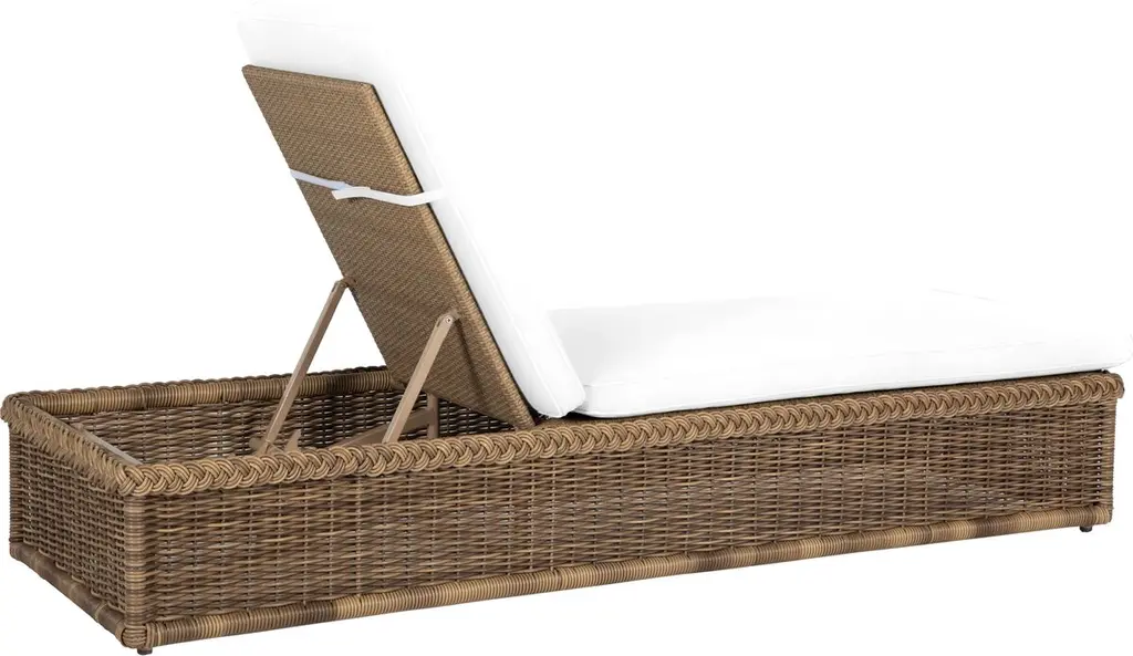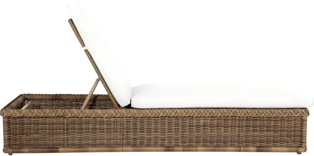 Designed by us and available only at One Kings Lane: The intricate braid detailing around the base is just one feature that makes this outdoor chaise a standout. The chaise also has an adjustable back for optimal comfort.Also of note: • N-dura resin wicker, which looks like natural rattan but is UV-resistant and impressively durable, is handwoven over equally long-lasting aluminum. �� The cushions are covered in stain-resistant, mold-resistant, fade-resistant fabric.