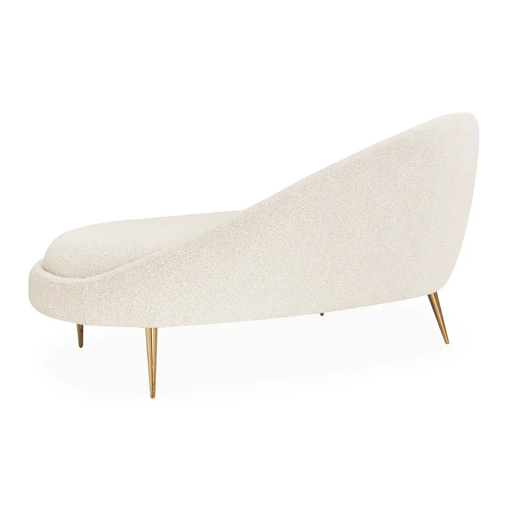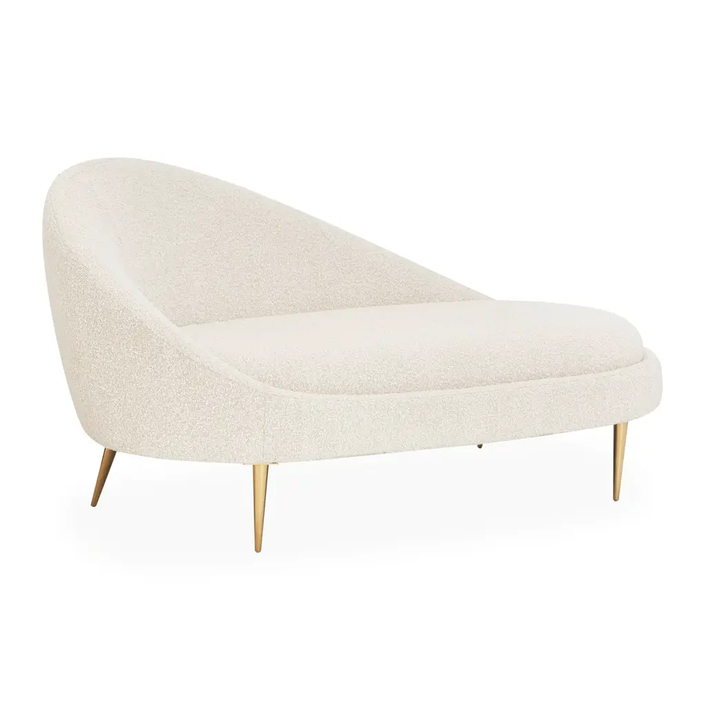 Heaven Sent. Low, loungey, and incredibly comfortable, our Ether collection has a simple genesis story: Jonathan wanted to create seating that looks and feels like heaven. Our Ether Chaise features a lozenge-like silhouette hugs at one end and slopes at the other, while gleaming brass stiletto legs add lift and polish fit for a formal parlor. Ethereal yet edgy, but also warm and inviting in our favorite nubby neutral—Olympus Oatmeal bouclé. A sculptural touch in your boudoir, or mirror a pair in your living room for serene symmetry. Available as a left- or right-arm chaise.