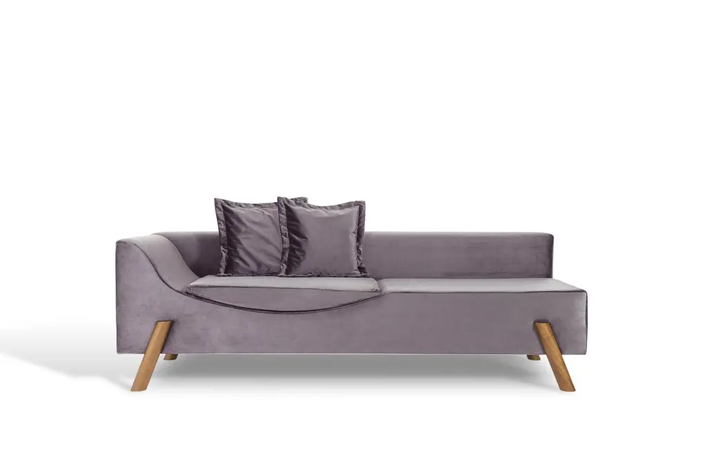 The Flag Couch is a smart and multifunctional piece.The couch has a cushion built into the seat that makes the piece with dual functionality: when is closed, it works as a comfortable living sofa to seat, and when is opened it becomes a chaise longue, allowing the user to relax in an ergonomic way.The seat cushion is loose, just fitted in the seat, making it easier for the user to use. It is a piece with a unique and exclusive design.Get inspired by watching the couch/chaise's use video.-Accompanies plus two loose cushions to a better comfort. (If you want more, it is possible to request a quote). Measuring 45x45 cm each.-This reference is upholstered in light pink velvet - see others fabric options in the brand's storefront.-The feet are made machined in natural tauari wood (Brazilian reforest wood), and are disassembled in the packaging, with instructions.