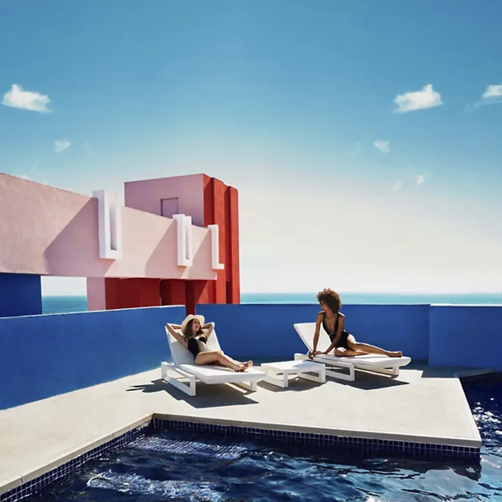 Designed especially to provide a convenient surface--and complementary contemporary style--next to the Frame Sun Outdoor Chaise Table, the Vondom Frame Sun Chaise Table is low and angular. It is rotation molded out of matte white polyethylene to ensure the sharp lines of its base and perfectly smooth expanse of its top.