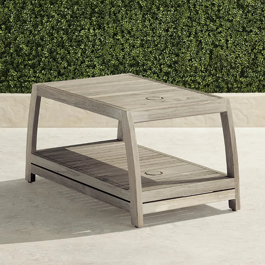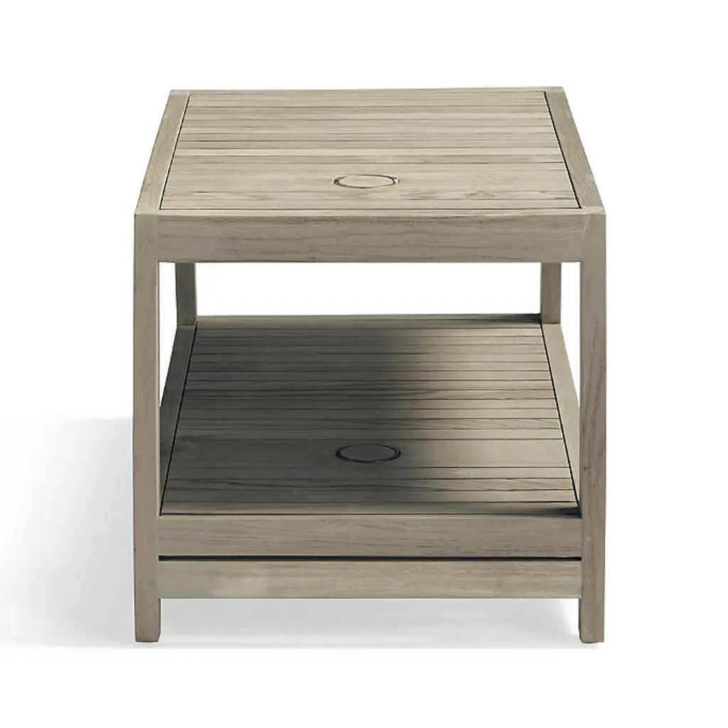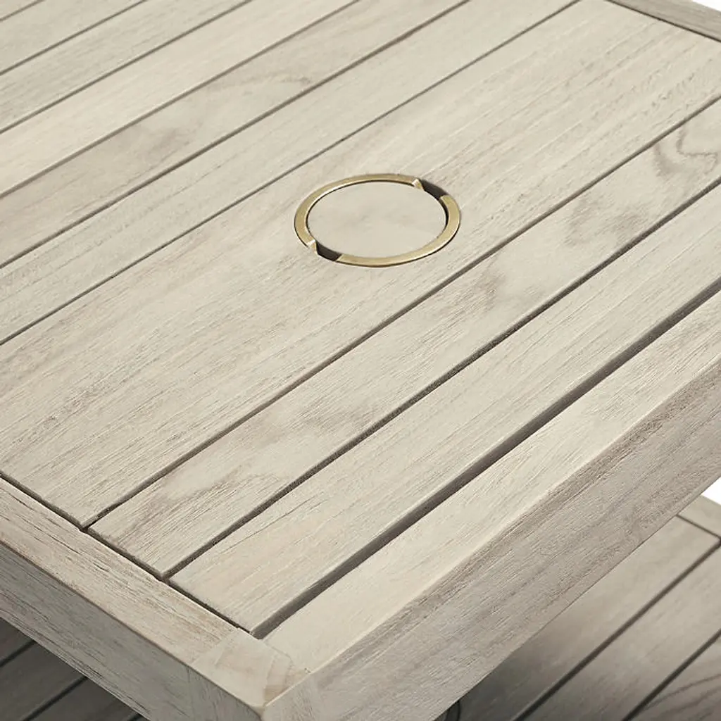 We engineered our Newport Teak Chaise Table to stand the test of time. Crafted of sustainably harvested, high-quality weathered teak, there's no better spot to hold your favorite items on a pool day. The long proportions of this table are perfect for placing between two chaises. With a built-in umbrella holder, chaises on either side can benefit from the umbrella's shade. Hand-built from sustainably harvested, high-quality teak with Weathered finish that is naturally resistant to mildew, so it holds up to rain and humidity Durable teak frame is kiln dried to remove moisture, guarding against warping and cracking, and sanded by hand so it's smooth to the touch Teak naturally releases resinous oils as it weathers; using a rug is recommended to help prevent staining of deck or patio surfaces Lower shelf for additional storage 2-1/4" umbrella hole with cap Table can be used with umbrella by placing over umbrella base (not included) We recommend removing the brass fitting and teak cap to use with our Belmont 50-lb. Umbrella Base for optimal fitting and to avoid umbrella pole scratching against brass fitting Adjustable feet for leveling Coordinates with Newport Weathered Teak Chaises, Set of Two To prevent injuries or damage to item, recommended team lift (two or more people) for placement of tables Arrives assembled A Frontgate exclusive. At Frontgate, our primary focus is quality. We guarantee that every product we sell will stand up to the supreme test – our customers' satisfaction. To learn more about our policies, visit our Shipping & Processing, Returns & Exchanges and Warranty & Price Guarantee pages.
