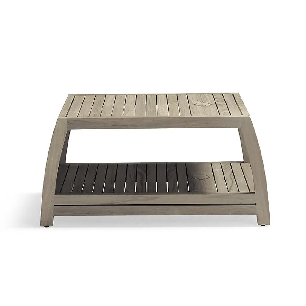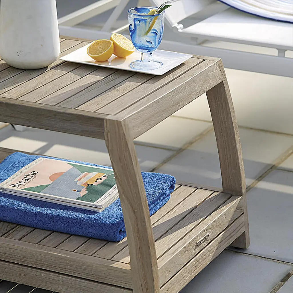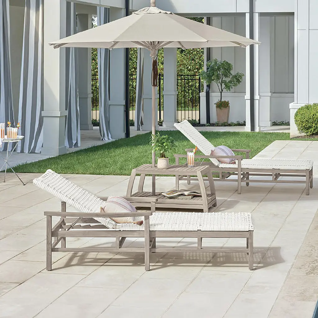 We engineered our Newport Teak Chaise Table to stand the test of time. Crafted of sustainably harvested, high-quality weathered teak, there's no better spot to hold your favorite items on a pool day. The long proportions of this table are perfect for placing between two chaises. With a built-in umbrella holder, chaises on either side can benefit from the umbrella's shade. Hand-built from sustainably harvested, high-quality teak with Weathered finish that is naturally resistant to mildew, so it holds up to rain and humidity Durable teak frame is kiln dried to remove moisture, guarding against warping and cracking, and sanded by hand so it's smooth to the touch Teak naturally releases resinous oils as it weathers; using a rug is recommended to help prevent staining of deck or patio surfaces Lower shelf for additional storage 2-1/4" umbrella hole with cap Table can be used with umbrella by placing over umbrella base (not included) We recommend removing the brass fitting and teak cap to use with our Belmont 50-lb. Umbrella Base for optimal fitting and to avoid umbrella pole scratching against brass fitting Adjustable feet for leveling Coordinates with Newport Weathered Teak Chaises, Set of Two To prevent injuries or damage to item, recommended team lift (two or more people) for placement of tables Arrives assembled A Frontgate exclusive. At Frontgate, our primary focus is quality. We guarantee that every product we sell will stand up to the supreme test – our customers' satisfaction. To learn more about our policies, visit our Shipping & Processing, Returns & Exchanges and Warranty & Price Guarantee pages.