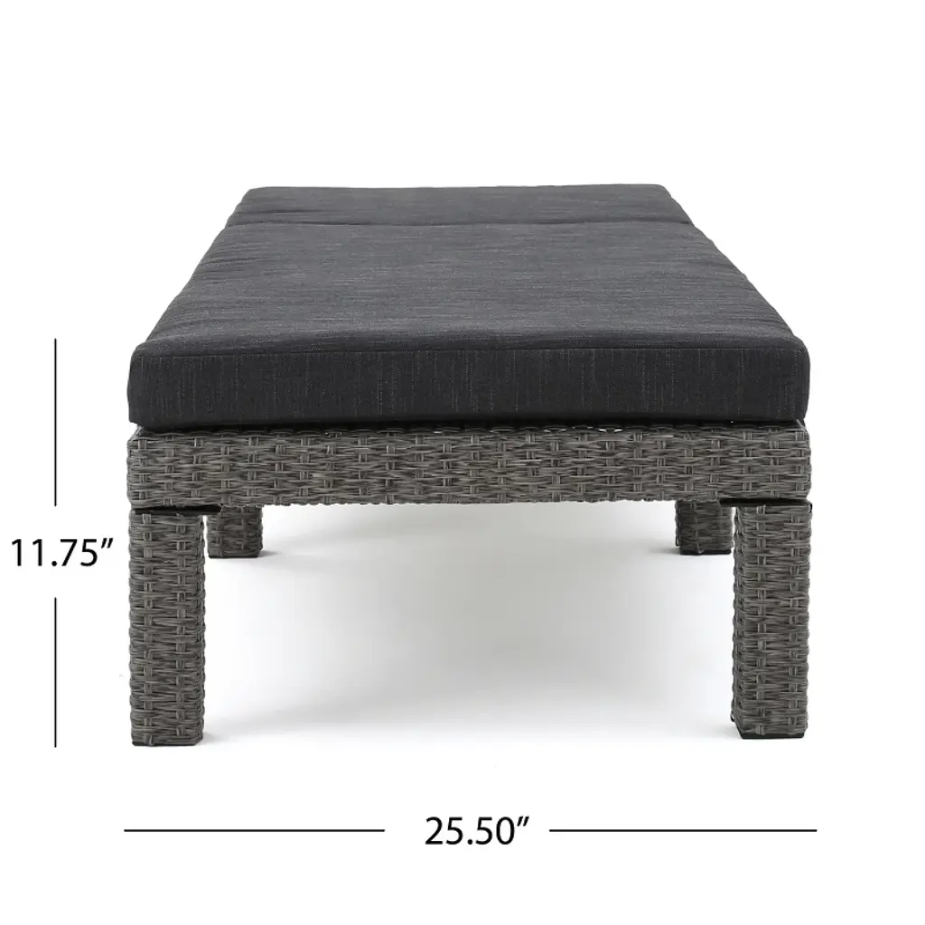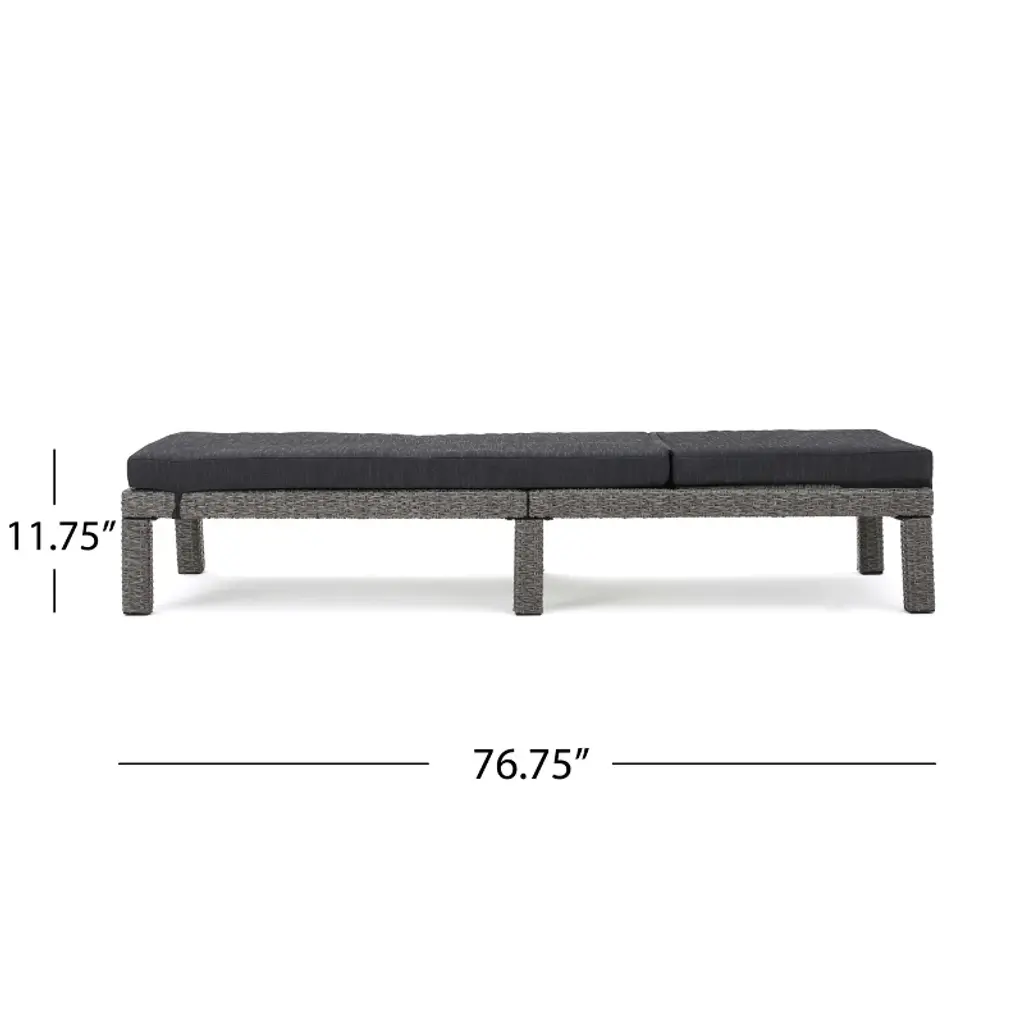 These exquisite wicker chaise lounges are the perfect addition to your patio, combining exceptional comfort with sophisticated style. Designed for ultimate outdoor relaxation, each lounge comes with a water-resistant cushion that ensures durability and convenience, no matter the weather. The extra-thick cushions are thoughtfully crafted to deliver unparalleled comfort, cradling you in luxury as you bask in the sun, enjoy a book, or indulge in a peaceful nap under the open sky. Whether you're creating a tranquil retreat for yourself or a welcoming space for guests, these lounges elevate your outdoor living experience. Once you experience the sheer comfort of these lounges, you’ll wish every piece of furniture in your home could match their level of relaxation and charm. Material: Faux Rattan Cushion Material: Water Resistant Fabric Fabric Composition: 100% Polyester Frame Material: Iron Some Assembly Required Dimensions: 76.75 inches deep x 25.50 inches wide x 11.75 inches high