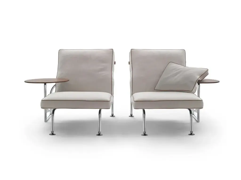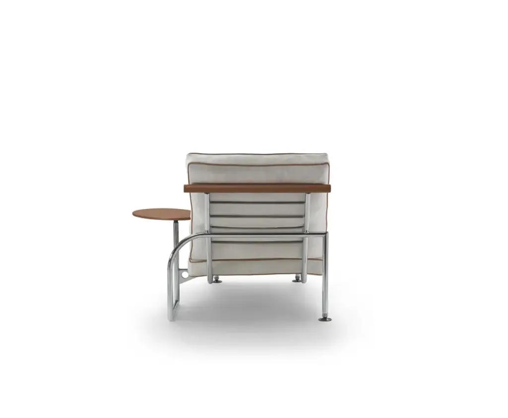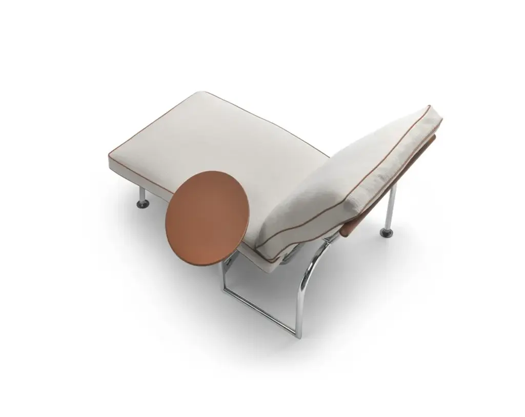 GINGER is an upholstered chaise longue.Structure: tubular metal in chrome and burnished finishes. Wooden bar upholstered in leather (all leathers from the collection). Steel spring in chrome finish.Seat: made of metal with a differentiated density polyurethane foam insert, polyester fiber padding, and protective fabric upholstery.Back cushion: made of sterilized goose down (certified Assopiuma, gold label).Side table: pivoting, integrated wooden table upholstered in leather matching the backrest bar color (all leathers from the collection) with a black painted metal frame. The sofa includes the pivoting table on both sides.Feet: ground support on thermoplastic tips.Upholstery profile: the upholstery features a grosgrain profile, available in all colors from the sample swatch.Upholstery: removable, available in both fabric and leather versions.Ginger is now being reintroduced due to the timeless relevance of its design, which combines formal elegance with a high level of comfort.It features a sinuous tubular metal frame that supports soft seat and back cushions, as well as a practical swiveling side table that serves as a functional surface integrated into the structure itself. The back cushion, generously padded with goose down, rests on an elegant cylindrical bar upholstered in leather and supported by springs, ensuring optimal support.