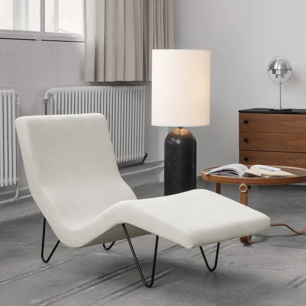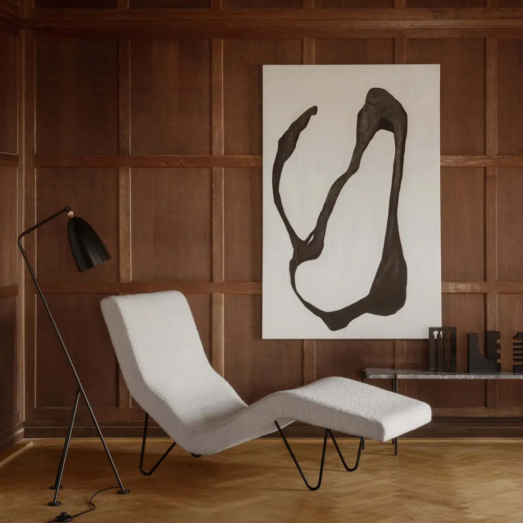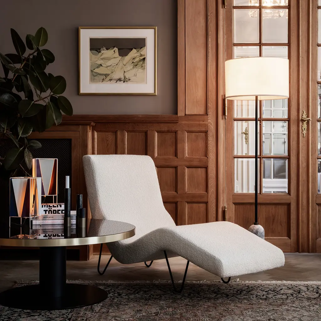 Settling in Los Angeles at midcentury, Swedish designer Greta M. Grossman felt a casual California influence, like this streamlined 1951 chaise. GMG is perfectly shaped for unencumbered relaxation, mirroring the body’s natural curves. Calm and carefree, it appears to float in slender metal legs—a Greta signature.