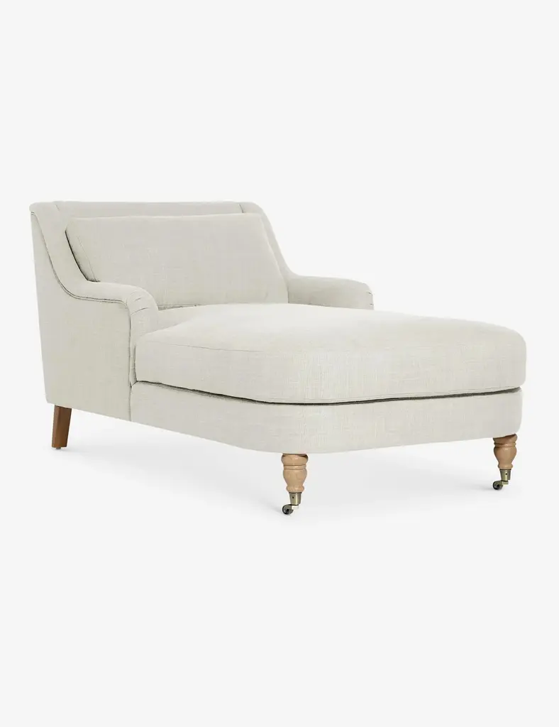 Available only at One Kings Lane: Not only is this roomy chaise timelessly elegant, but it's also impressively practical. The frame is made of wood that's been kiln-dried for maximum stability and casters on the front legs help protect your floors while making the chaise easy to move. It's comfortable too, thanks in large part to the plump, durable cushion fill wrapped in a down blend. And have we mentioned that this chaise is made right here in the USA?One Kings Lane brings you a line of handcrafted, made-to-order furnishings and decor designed by us and available only here. In keeping with our distinctive aesthetic, the pieces range from classic to contemporary and are available in a gorgeous variety of handpicked fabrics, finishes, and hardware.