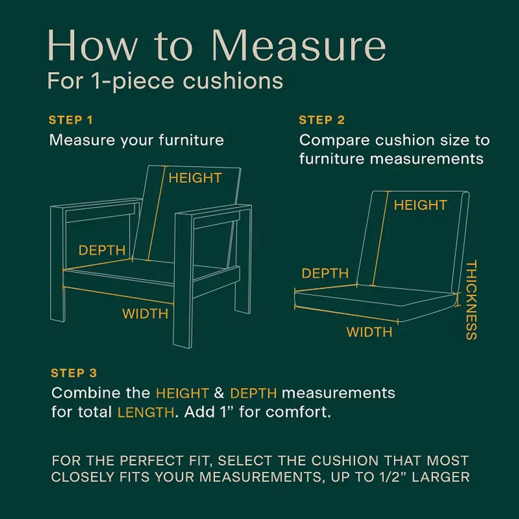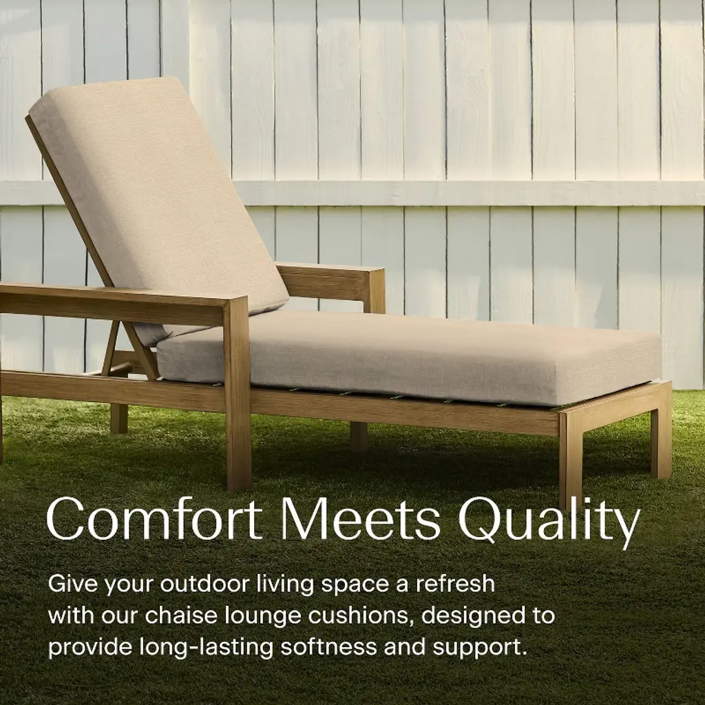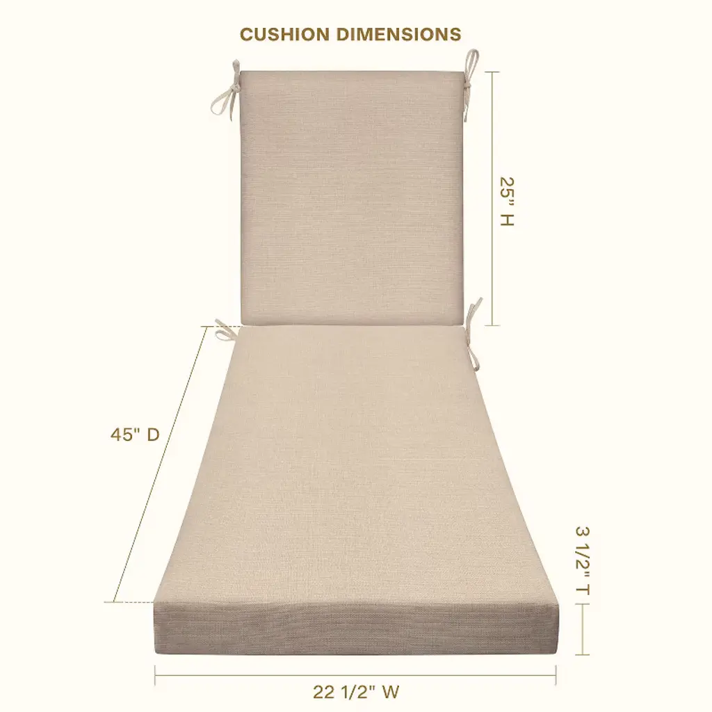 Add a splash of color & comfort to your outdoor living space with our chaise lounge patio cushion. Crafted with durable & stylish fabrics, this cushion will resist the elements while remaining bright and beautiful for years to come. Finished & filled in the US with superior polyester fiber for long-lasting comfort and support. Measures 22 1/2"W x 70"L x 3 1/2" thick. Seat: 45D; Back: 25H.