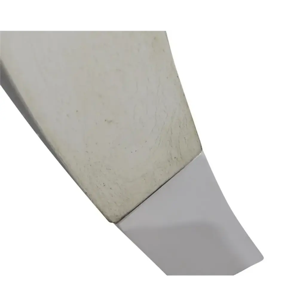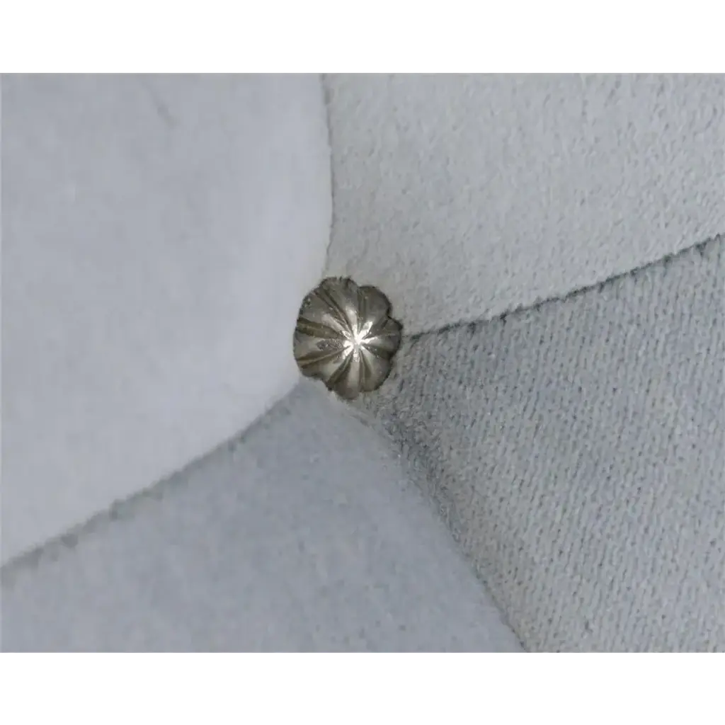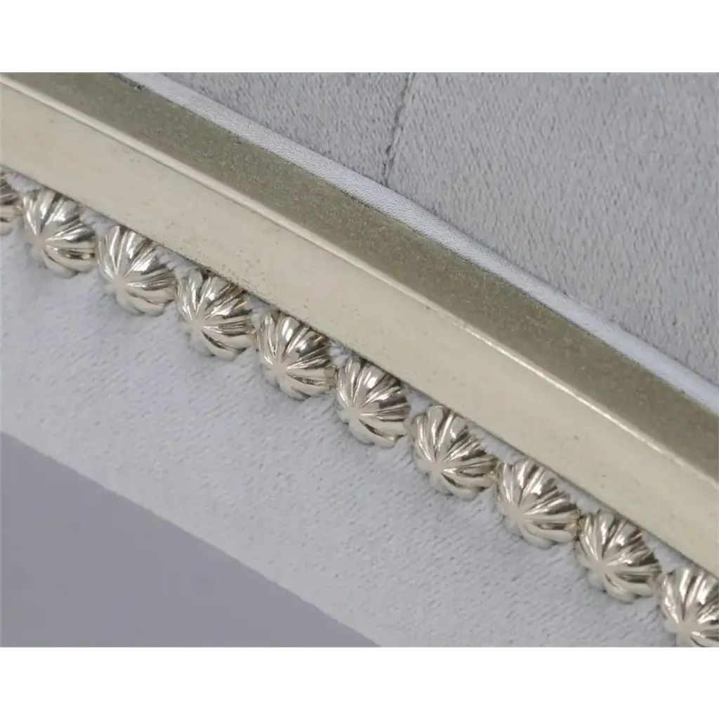 Hudson Chaise shown in V226 Burnished Silver finish with Polished Nickle metal Ferrules and 2207 fabric. This sleek, modern chaise features an undulating silhouette. It is upholstered in a box-pleated bouclé in pale grey velvet. The curvilinear shape is emphasized by an exposed wood frame finished in burnished silver. The classic saber legs are accentuated with stainless steel ferrules.