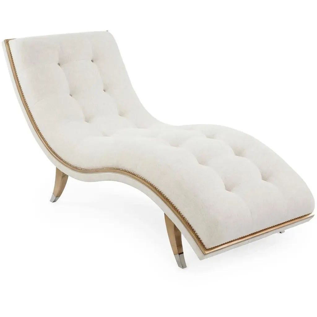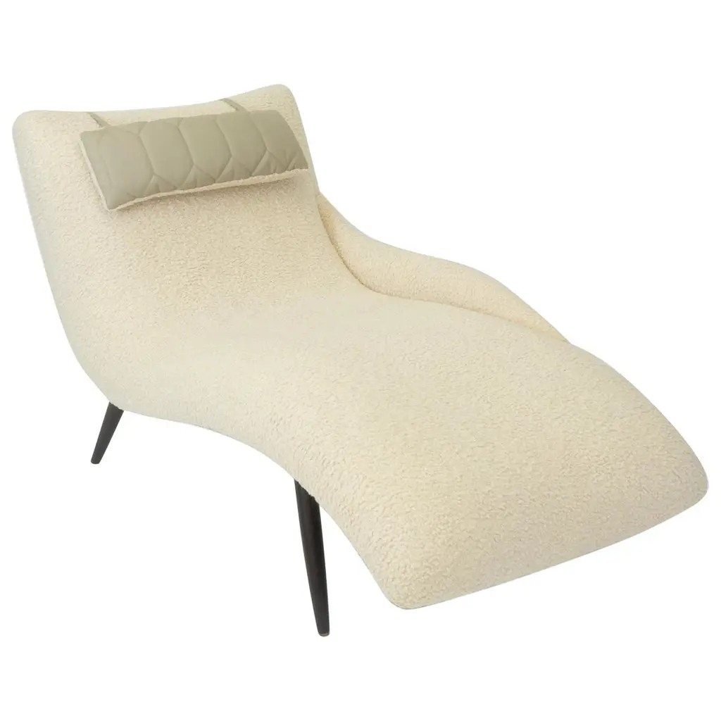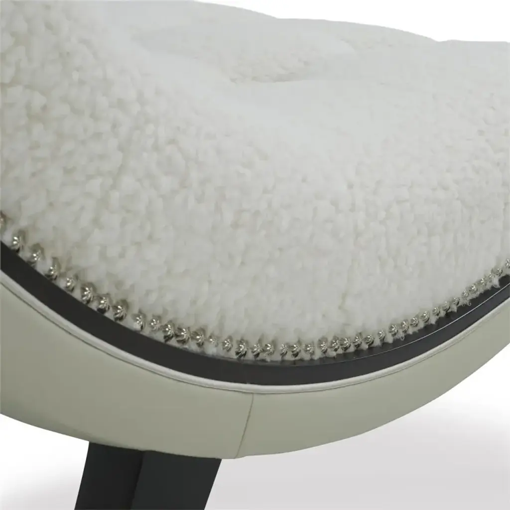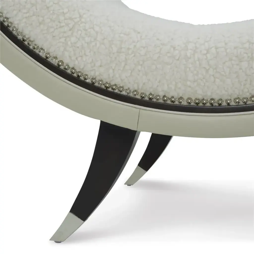The Hudson Chaise is a sleek, contemporary statement piece that infuses a space with an aura of luxury. Crafted from beech wood with subtly curved steel supports, the piece showcases seductive curvature along its tufted seat. The chaise is upholstered in Agnello Bianco 5014 fabric, featuring hints of light gray leather and small welt trim in Gimlet String 1120. Nickel starburst nailhead trim and a slender border finished in espresso line the piece to complete the look.