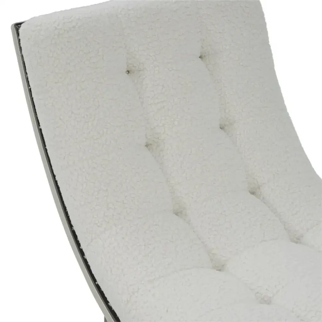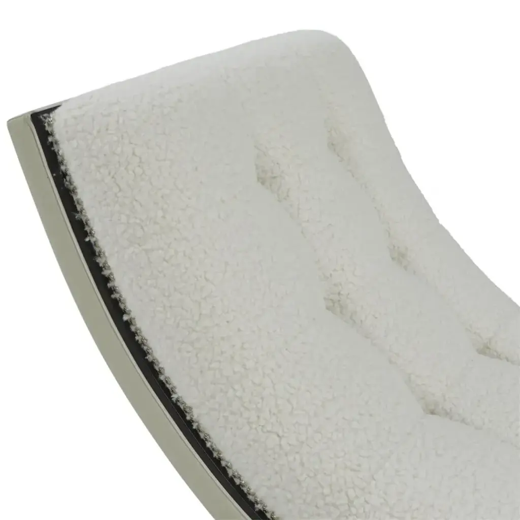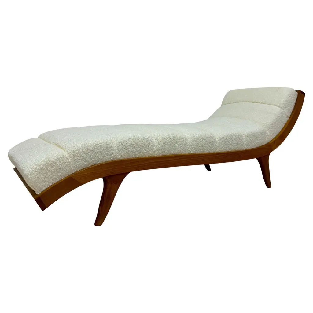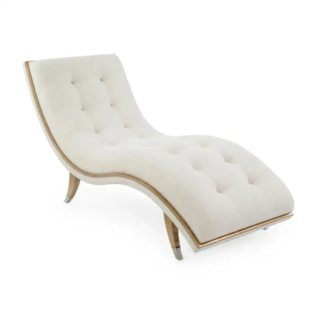 The Hudson Chaise is a sleek, contemporary statement piece that infuses a space with an aura of luxury. Crafted from beech wood with subtly curved steel supports, the piece showcases seductive curvature along its tufted seat. The chaise is upholstered in Agnello Bianco 5014 fabric, featuring hints of light gray leather and small welt trim in Gimlet String 1120. Nickel starburst nailhead trim and a slender border finished in espresso line the piece to complete the look.