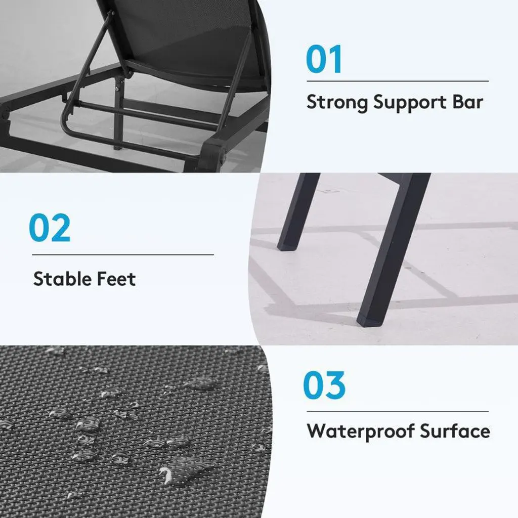 Upgrade your lounging experience with our 5-Position Adjustable Aluminum Chaise – the perfect blend of comfort, convenience, and durability. Find your ideal recline with multiple backrest angles, from upright for reading to near-flat for sunbathing. Stay secure with front and rear locking legs that prevent accidental folding, so you can relax with total peace of mind. Built with a lightweight yet ultra-strong aluminum frame (supports up to 270lbs!), this chaise is rust-proof and designed for all-weather use, whether by the pool, on the patio, or indoors. The UV-resistant fabric stays cool and vibrant season after season. Need to save space? The quick-fold design collapses flat in seconds for effortless storage. Compact, sturdy, and stylish – your perfect lounging companion is here! Perfect for: Small balconies & patios Poolside relaxation Indoor/outdoor versatility Easy storage when not in use Effortless comfort, built to last!