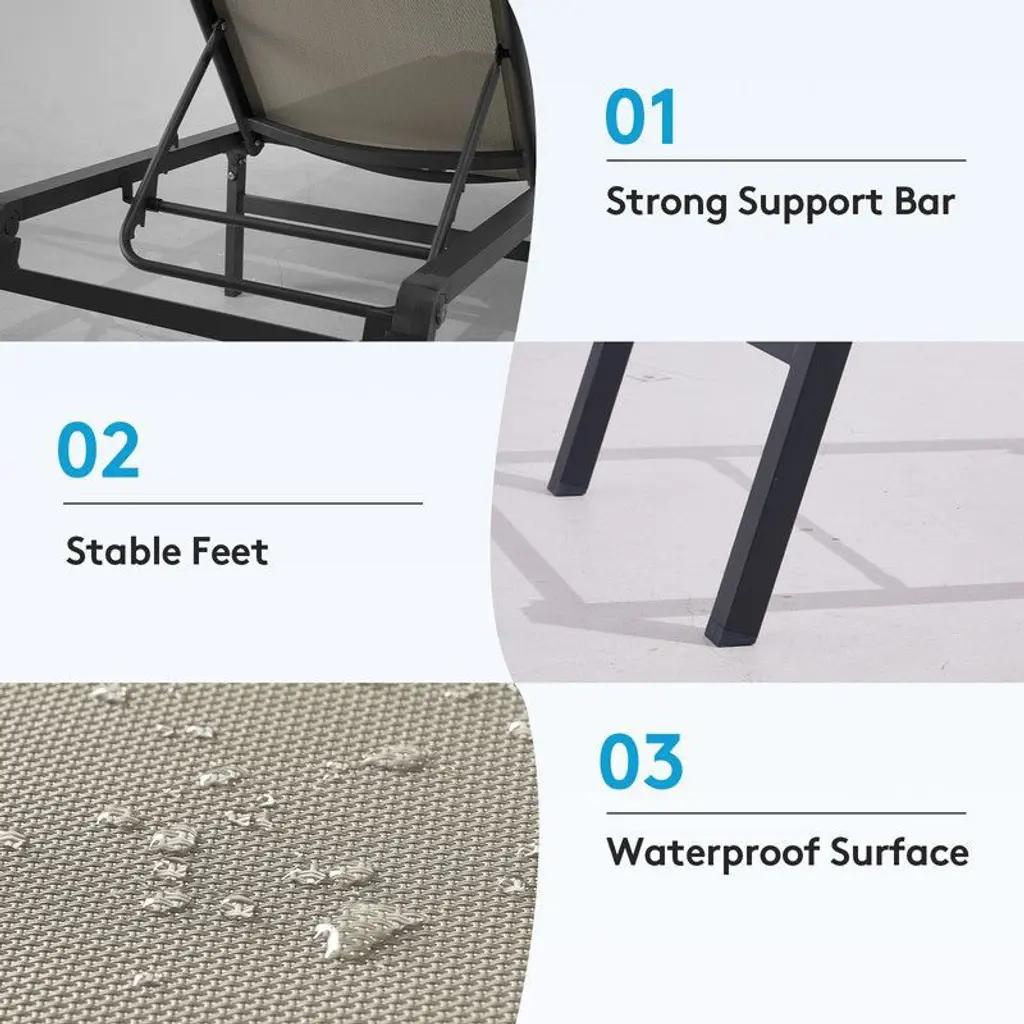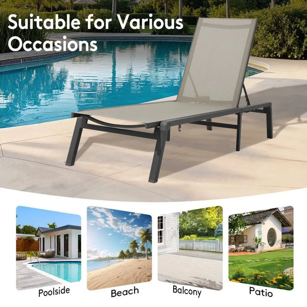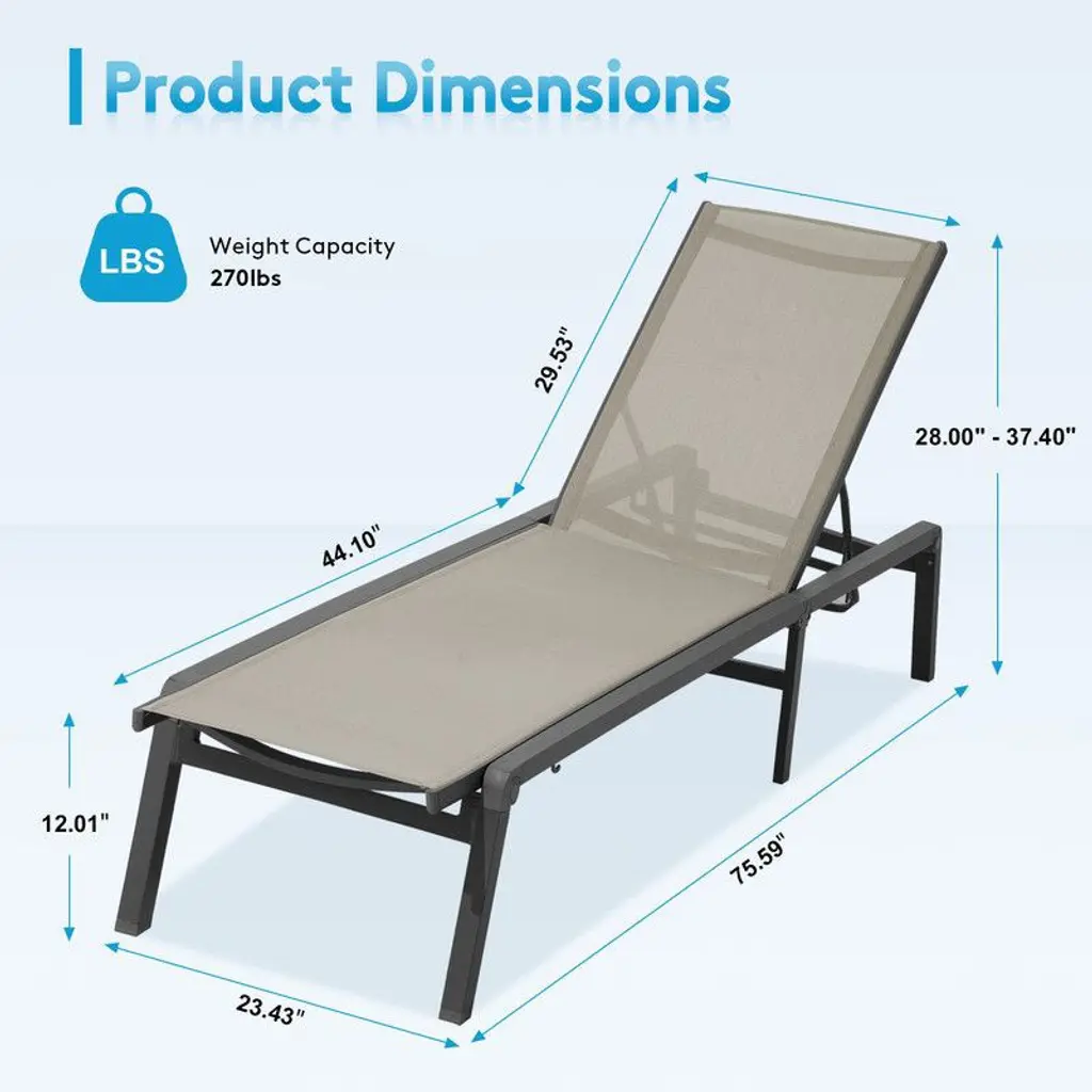 Upgrade your lounging experience with our 5-Position Adjustable Aluminum Chaise – the perfect blend of comfort, convenience, and durability. Find your ideal recline with multiple backrest angles, from upright for reading to near-flat for sunbathing. Stay secure with front and rear locking legs that prevent accidental folding, so you can relax with total peace of mind. Built with a lightweight yet ultra-strong aluminum frame (supports up to 270lbs!), this chaise is rust-proof and designed for all-weather use, whether by the pool, on the patio, or indoors. The UV-resistant fabric stays cool and vibrant season after season. Need to save space? The quick-fold design collapses flat in seconds for effortless storage. Compact, sturdy, and stylish – your perfect lounging companion is here! Perfect for: Small balconies & patios Poolside relaxation Indoor/outdoor versatility Easy storage when not in use Effortless comfort, built to last!