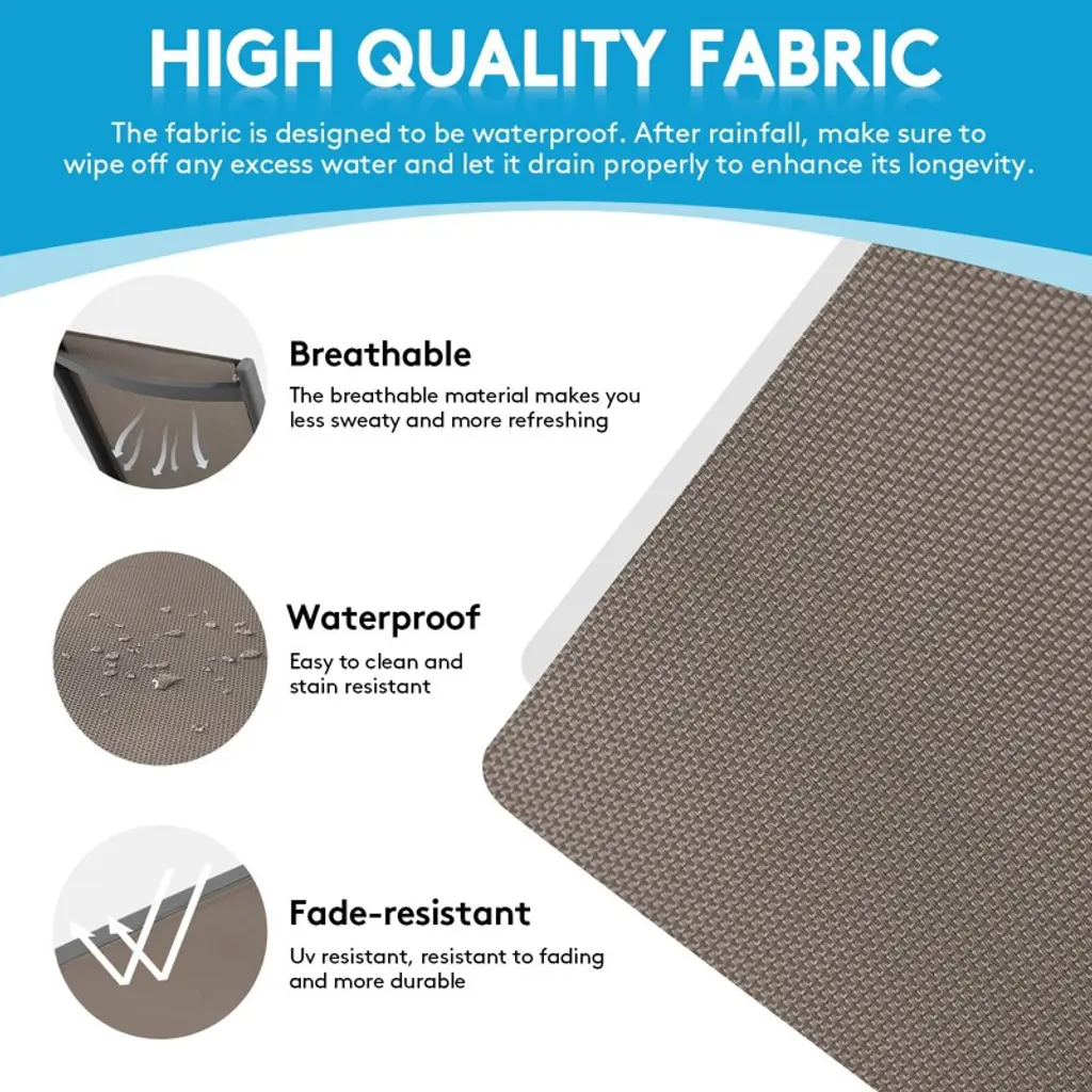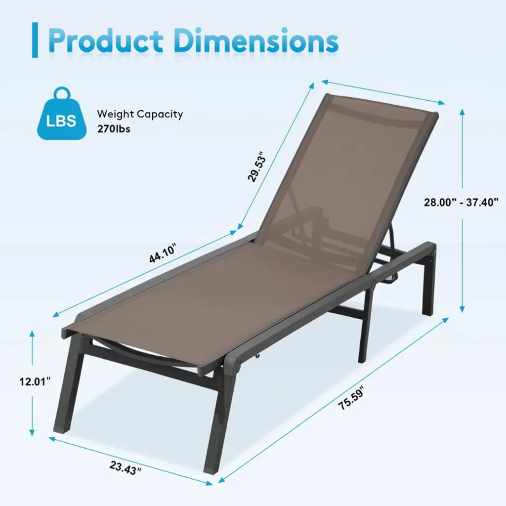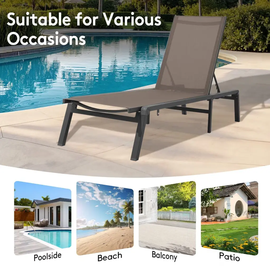 Upgrade your lounging experience with our 5-Position Adjustable Aluminum Chaise – the perfect blend of comfort, convenience, and durability. Find your ideal recline with multiple backrest angles, from upright for reading to near-flat for sunbathing. Stay secure with front and rear locking legs that prevent accidental folding, so you can relax with total peace of mind. Built with a lightweight yet ultra-strong aluminum frame (supports up to 270lbs!), this chaise is rust-proof and designed for all-weather use, whether by the pool, on the patio, or indoors. The UV-resistant fabric stays cool and vibrant season after season. Need to save space? The quick-fold design collapses flat in seconds for effortless storage. Compact, sturdy, and stylish – your perfect lounging companion is here! Perfect for: Small balconies & patios Poolside relaxation Indoor/outdoor versatility Easy storage when not in use Effortless comfort, built to last!