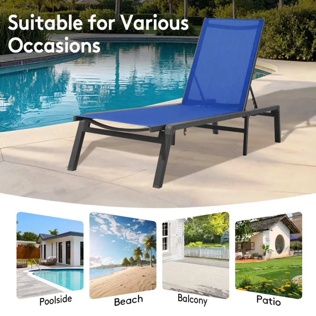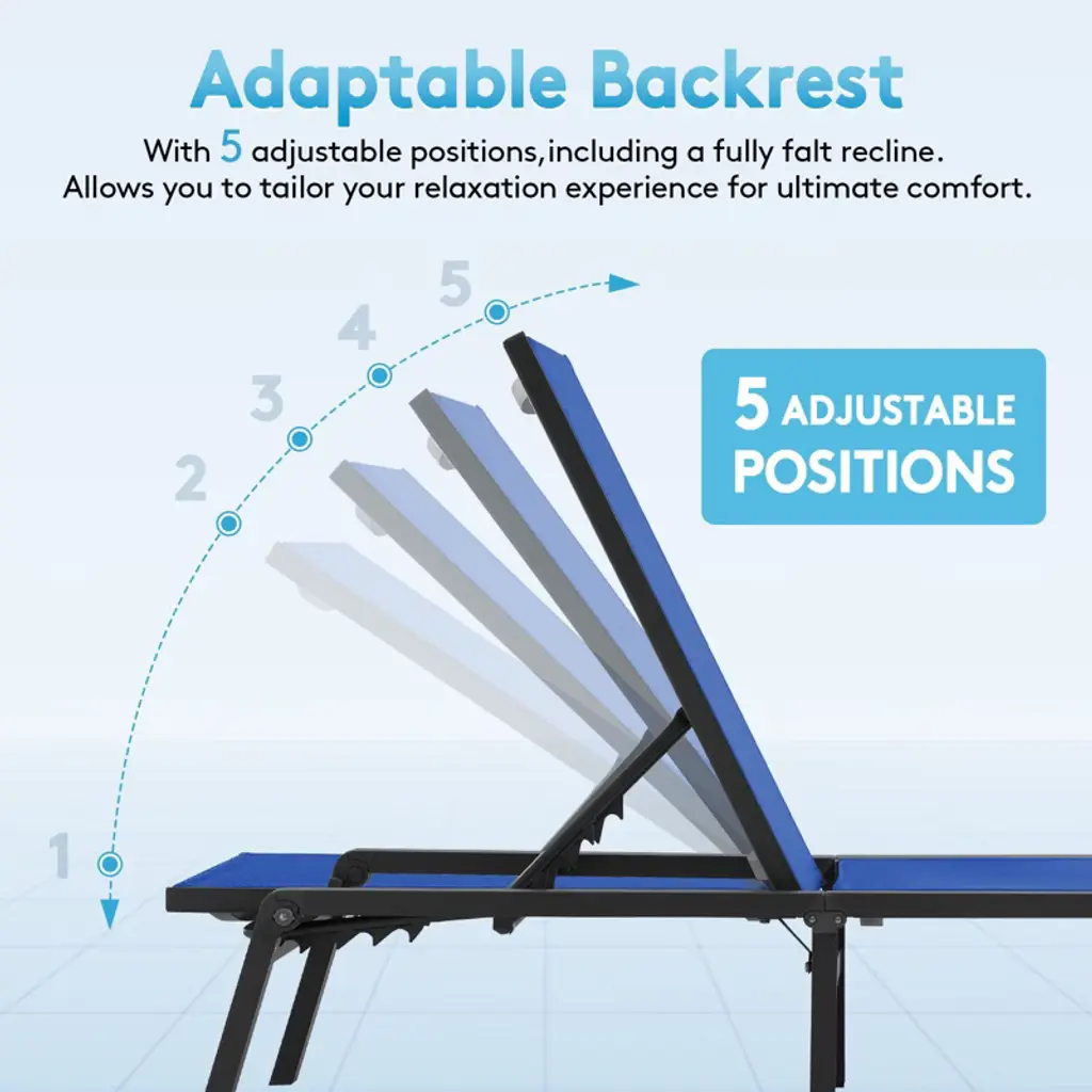 Upgrade your lounging experience with our 5-Position Adjustable Aluminum Chaise – the perfect blend of comfort, convenience, and durability. Find your ideal recline with multiple backrest angles, from upright for reading to near-flat for sunbathing. Stay secure with front and rear locking legs that prevent accidental folding, so you can relax with total peace of mind. Built with a lightweight yet ultra-strong aluminum frame (supports up to 270lbs!), this chaise is rust-proof and designed for all-weather use, whether by the pool, on the patio, or indoors. The UV-resistant fabric stays cool and vibrant season after season. Need to save space? The quick-fold design collapses flat in seconds for effortless storage. Compact, sturdy, and stylish – your perfect lounging companion is here! Perfect for: Small balconies & patios Poolside relaxation Indoor/outdoor versatility Easy storage when not in use Effortless comfort, built to last!