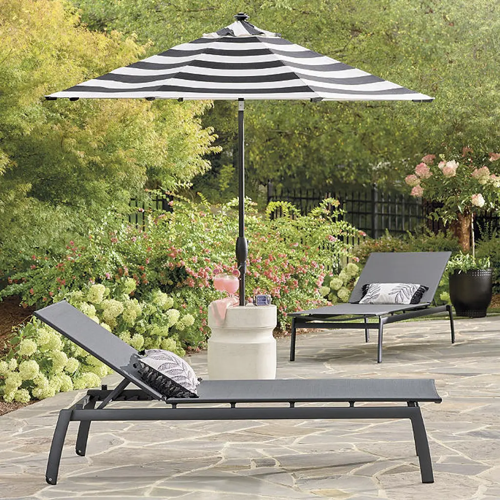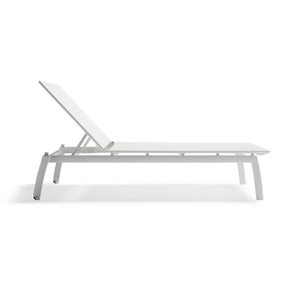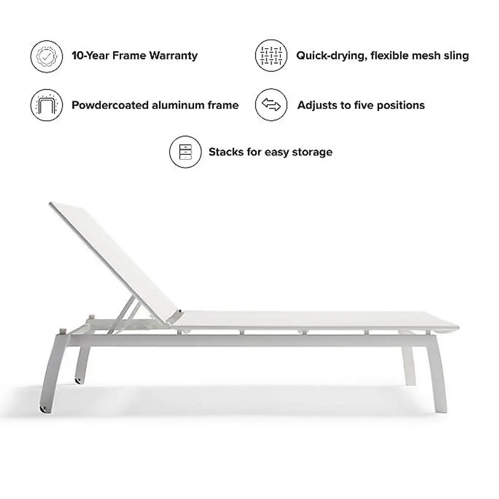 Generously sized and crafted from corrosion-resistant aluminum with a powdercoated finish, our Ibiza Aluminum Chaise features a modern silhouette with a quick-drying, flexible mesh sling that's supportive yet giving, and allows air to circulate to keep you cool. Quick-drying, flexible mesh sling Powdercoated aluminum frame resists corrosion Back adjusts to five positions, from upright to fully reclined Wheels in rear legs enable easy movement Coordinates with the Frontgate Resort Collection™ Newport Side Table Stacks for easy storage Imported A Frontgate exclusive. At Frontgate, our primary focus is quality. We guarantee that every product we sell will stand up to the supreme test – our customers' satisfaction. To learn more about our policies, visit our Shipping & Processing, Returns & Exchanges and Warranty & Price Guarantee pages.
