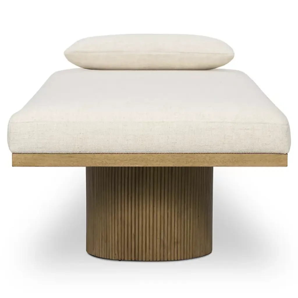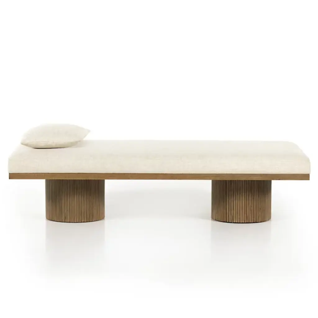 The Jakobi Chaise from Four Hands combines mid-century modern and contemporary styles with its striking design. Two vertically grooved cylinder columns provide a visually appealing support system for the rectangular base, topped with a fluffy foam-filled cushion and pillow for added comfort. The cushion and pillow are upholstered in performance fabric composed of a soft, strong blend of fibers, and it is stylish and strong, designed to withstand spills, stains, and high traffic. The frame, crafted from rubberwood veneer and engineered hardwood, ensures durability while elevating all who sit in it.