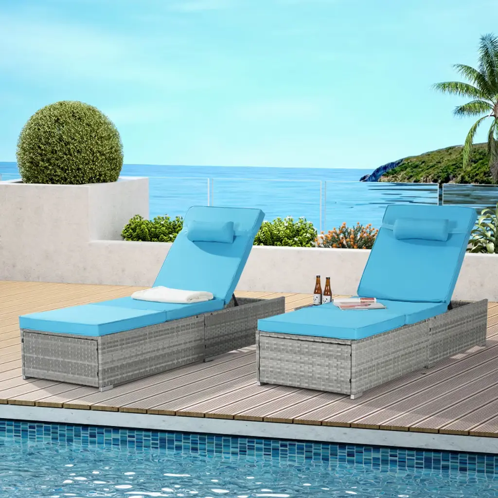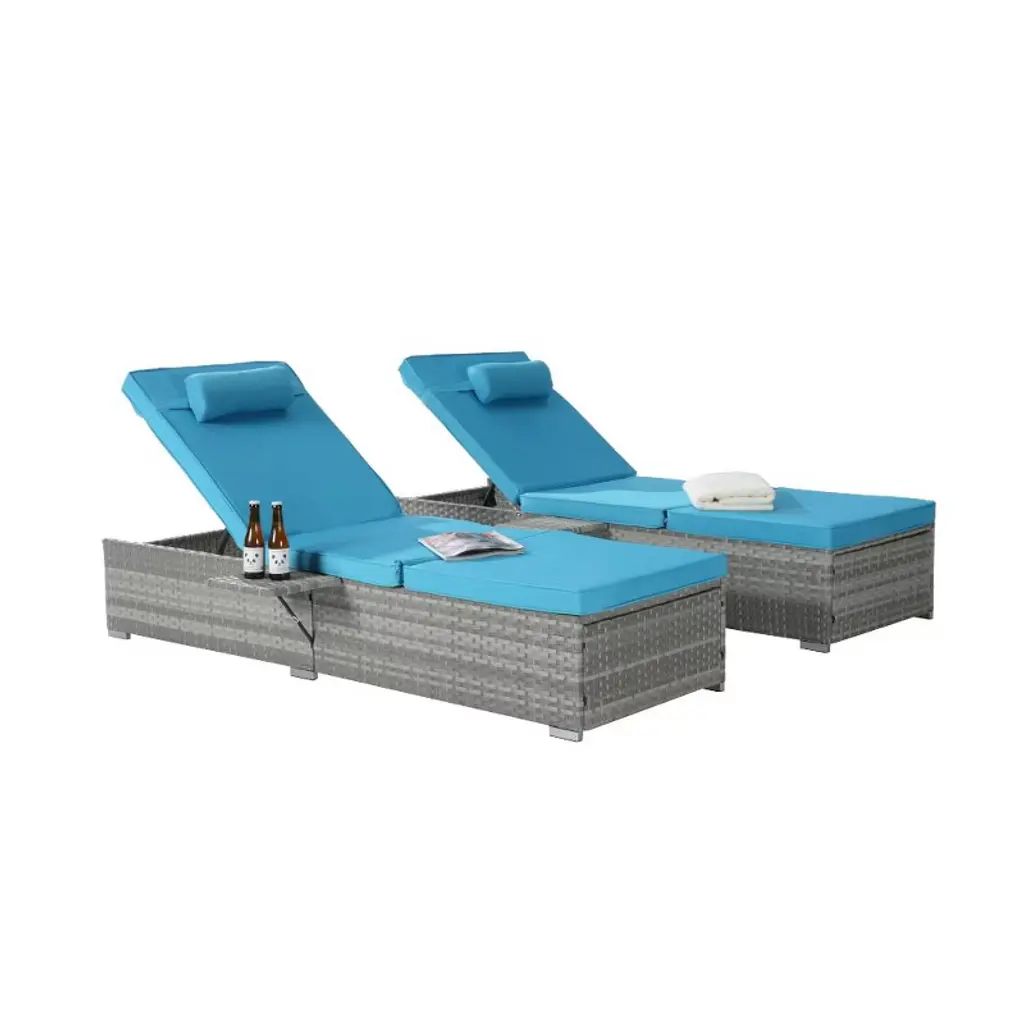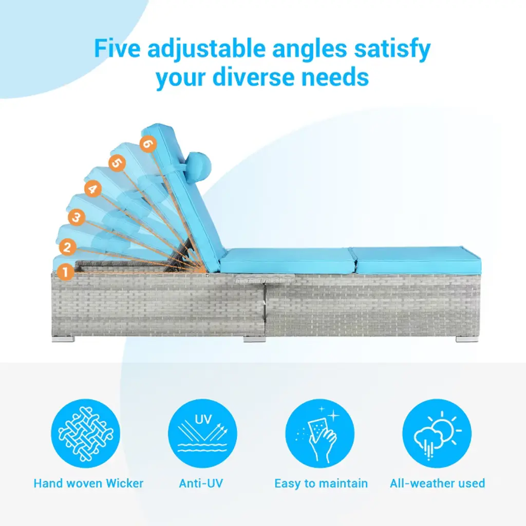 Jujabu Outdoor Rattan Chaise Lounges Set Of 2 With Side Table, Adjustable Backrest And Blue Cushions