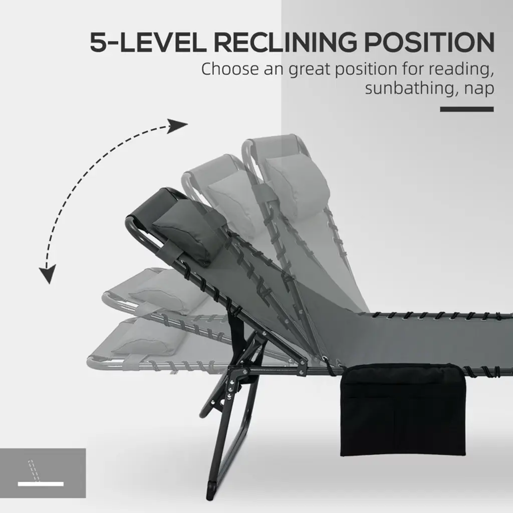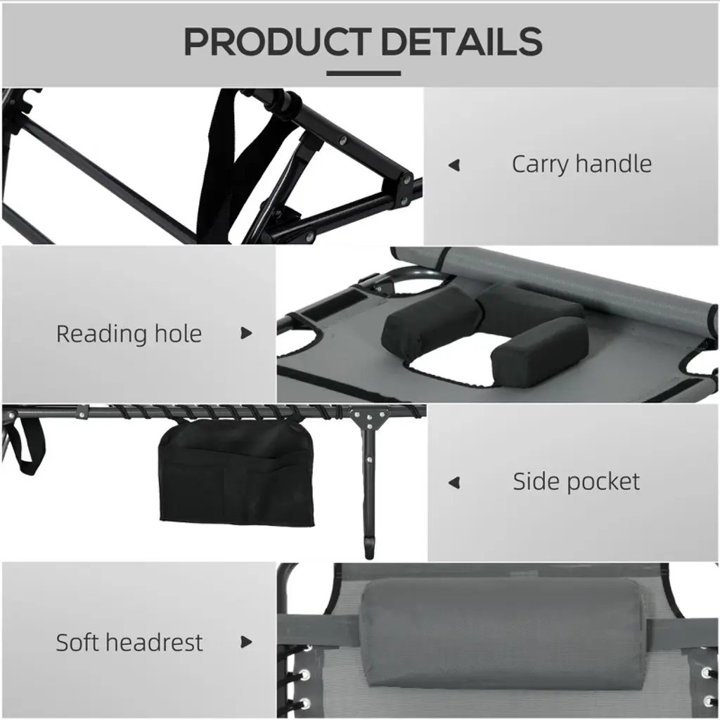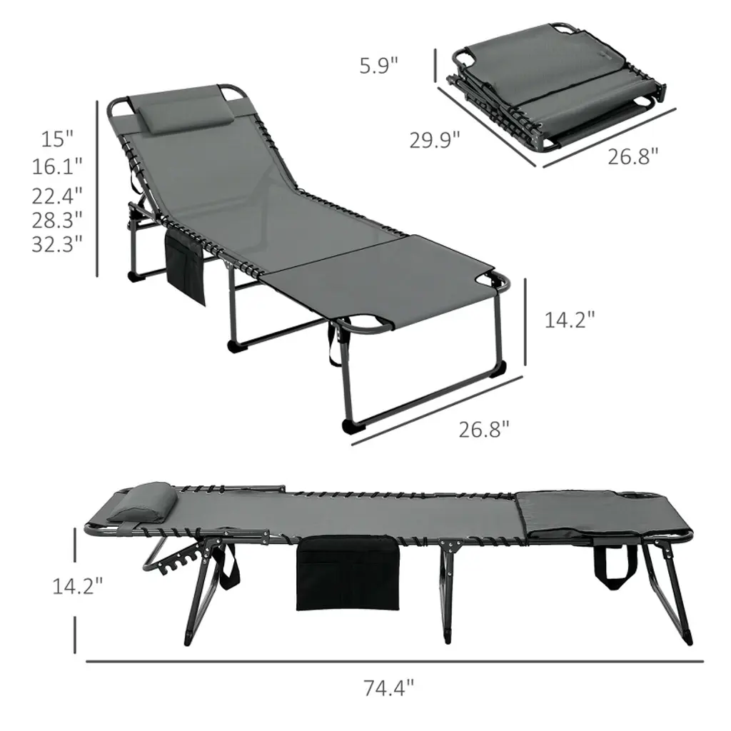 Ultimate Outdoor Comfort and ConvenienceStep outside and relax with this versatile outdoor sun lounger, designed for comfort and functionality. Its breathable mesh surface keeps you cool on warm days, while the plush pillow adds head support for ultimate relaxation. The adjustable backrest offers five reclining positions, including a convenient face hole perfect for lying face down while reading or resting. Stay organized with a built-in storage pocket for your phone, book, or essentials. The tri-fold design makes this chair easy to fold, store, and transport, fitting neatly into your car trunk or garage. Crafted with a durable steel frame and water-safe powder-coated finish, this lounger is built to withstand outdoor elements and provide lasting enjoyment.Product Details:Adjustable backrest with 5 positionsBreathable mesh fabric with plush pillowBuilt-in storage pocketFoldable tri-fold designDurable steel frame with powder coating