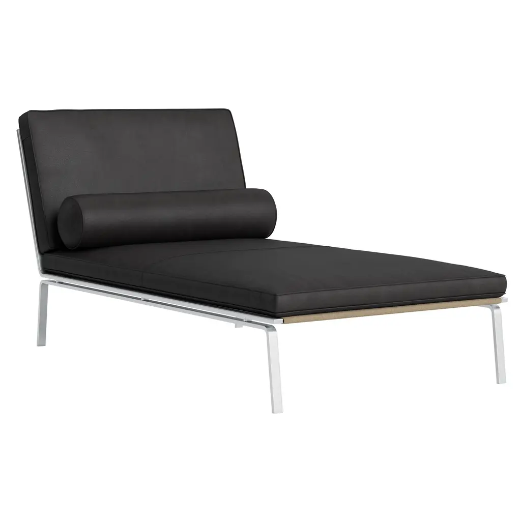 The Man Lounge Chaise Lounge, Designed by Rune Krøjgaard and Knut Bendik Humlevik, is inspired by mid-century Danish design and the Bauhaus movement. The chaises low frame is crafted from sleek stainless steel, which gives it a structured and industrial look. The chaise lounge stands out with its parallel frame structure and visible material joinery, epitomizing a clean and timeless design. Available in a curated range of luxurious fabric and leather and including a matching bolster pillow.