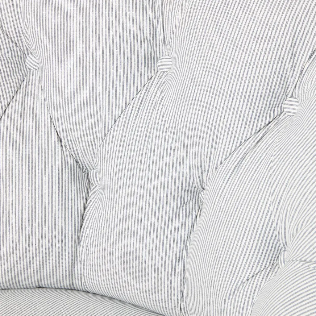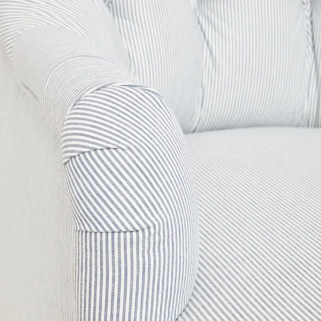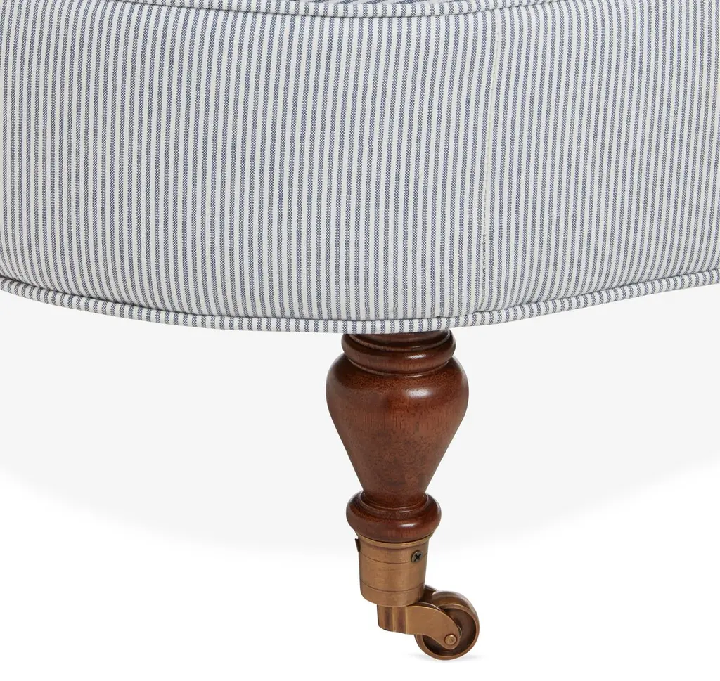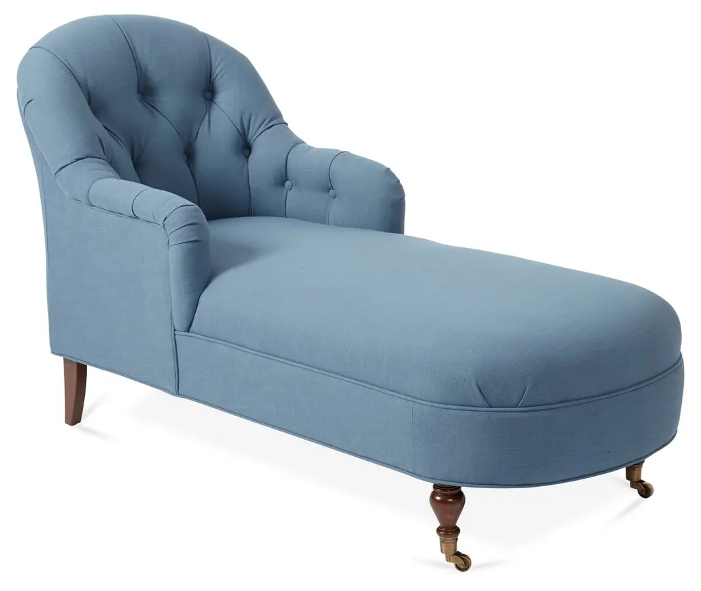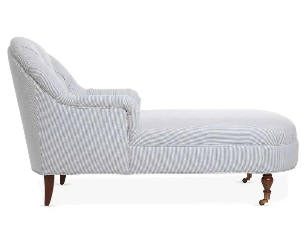 Designed by us and available only at One Kings Lane: Imbued with timeless style and form, this plush chaise shows off deep button tufts, English arms, and striped linen upholstery in classic blue and white. A fill of foam wrapped in down with a cotton duck core welcomes guests with long-lasting comfort and support, while casters on the two front legs allow for easy maneuverability. Made in the USA.
