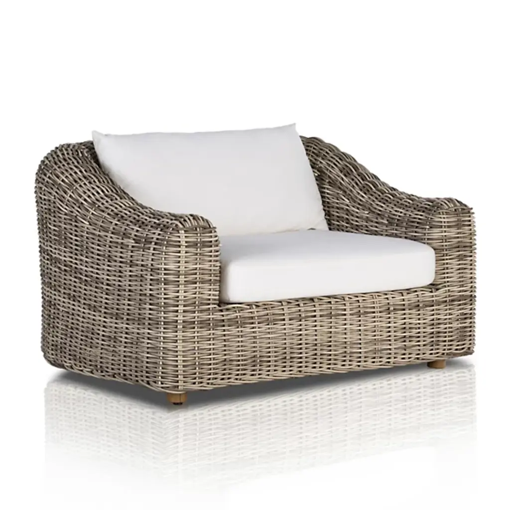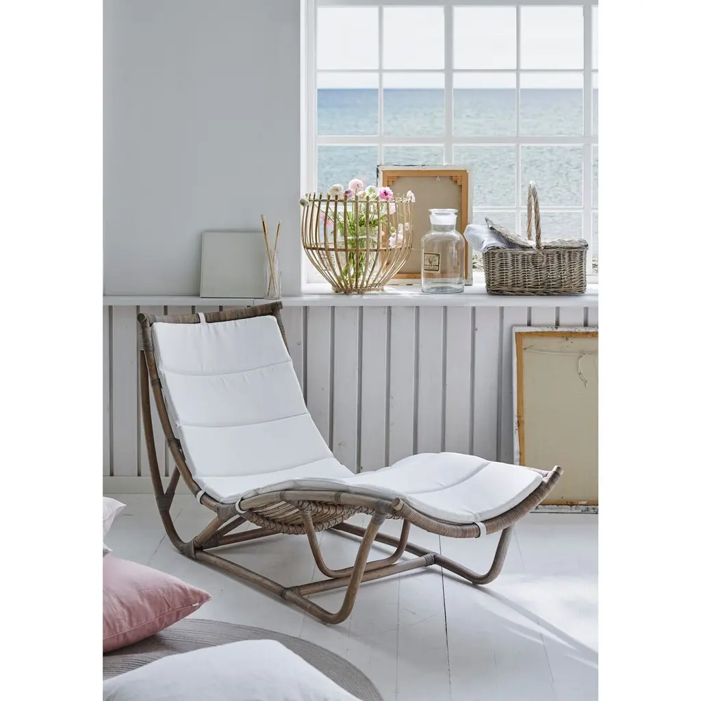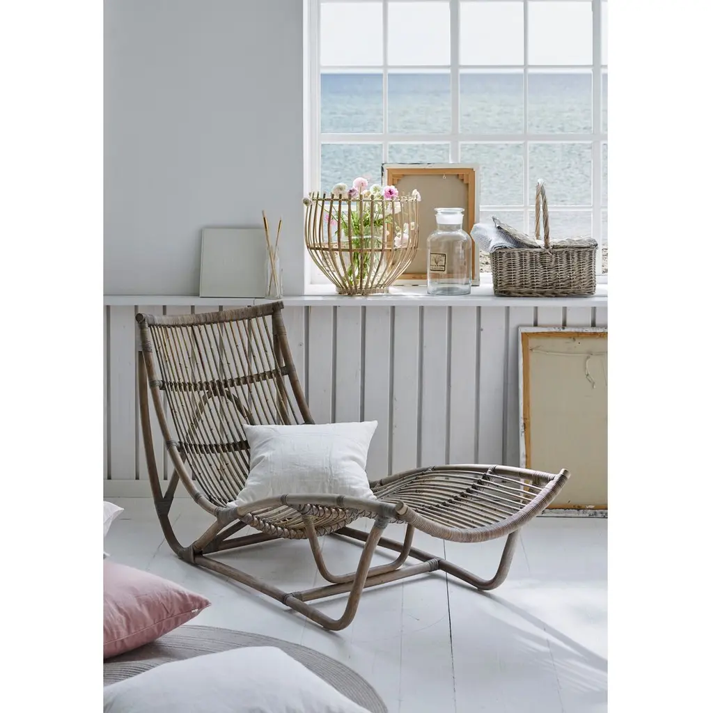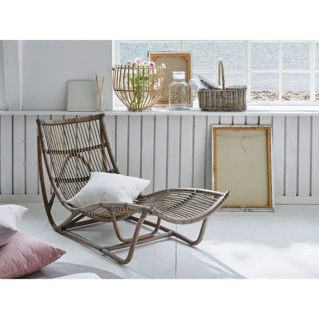 Designed in the allotment style of the 1950s and '60s, this rattan chaise features a curved, slatted frame, woven reinforcements, and a taupe-gray finish. Suitable for indoor use only.