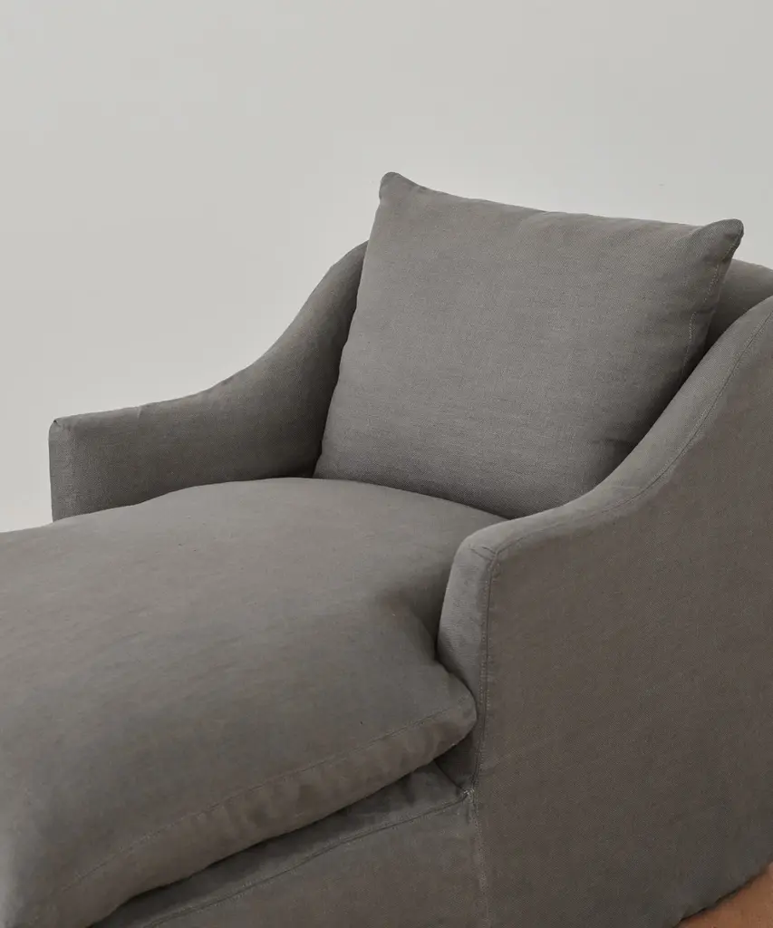 Miramar Chaise Smoke Linen Elegant chaise crafted from luxurious Belgian Libeco linen: 100% linen slipcover. Features feather down fill and foam core. Handmade in the USA, the Miramar Chaise is made for lounging in luxury. For furniture purchases, please refer to our furniture inspection policy here, and for help styling this piece in your space, contact [email protected] for a complimentary consultation. CA Residents: Prop 65 Information