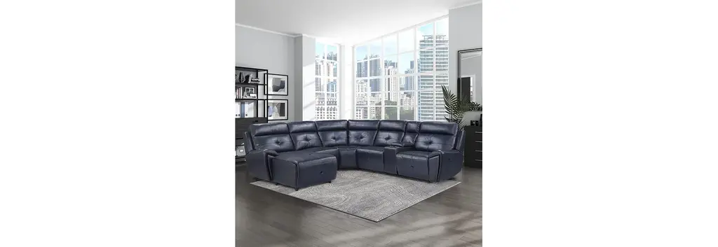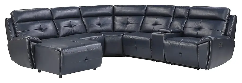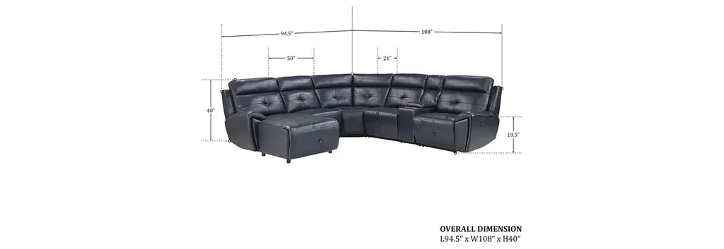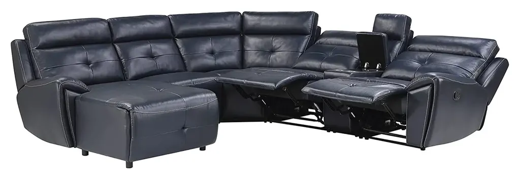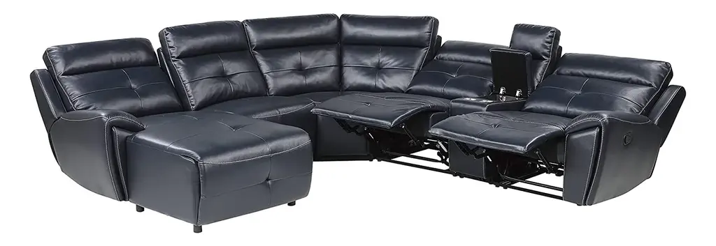 Fabric Composition: 90 Polyester, 10% ResinManual reclining modular sectional sofaPremium faux leather upholsteryFeatures two (2) recliners and one(1) push-back chaiseConsole features two (2) cup-holders and storageShips in six (6) boxes and requires minor assembly