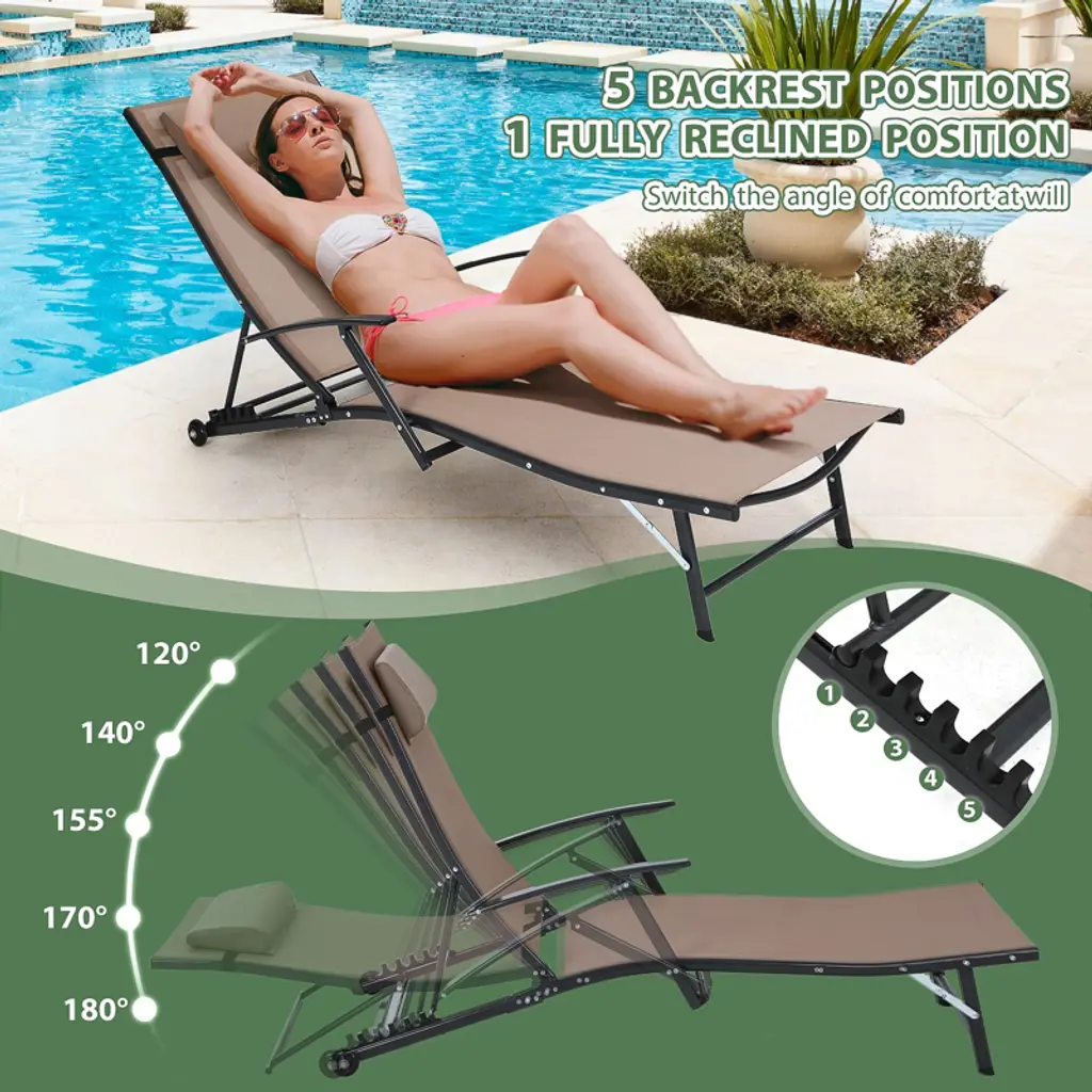 Enjoy the perfect balance of comfort and function with this adjustable outdoor chaise lounge. Designed with five reclining positions, a built-in wheel, and weather-resistant materials, it’s made for easy relaxation anywhere. Lightweight yet durable, it’s ideal for patios, pools, or backyards year-round.