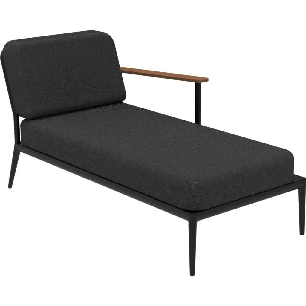 Nature black left chaise longue by mowee dimensions: d155 x w76 x h81 cm (seat height 42 cm). Material: aluminum, upholstery and iroko wood. Weight: 28 kg. Also available in different colors and finishes. An unmistakable collection for its beauty and robustness. A tribute to the valencian manufacturing tradition as a challenge to innovation, making it sustainable and durable. A fresher version, nature. It presents touches of natural and sustainable wood, which gives warmth and comfort, and makes it a unique collection.