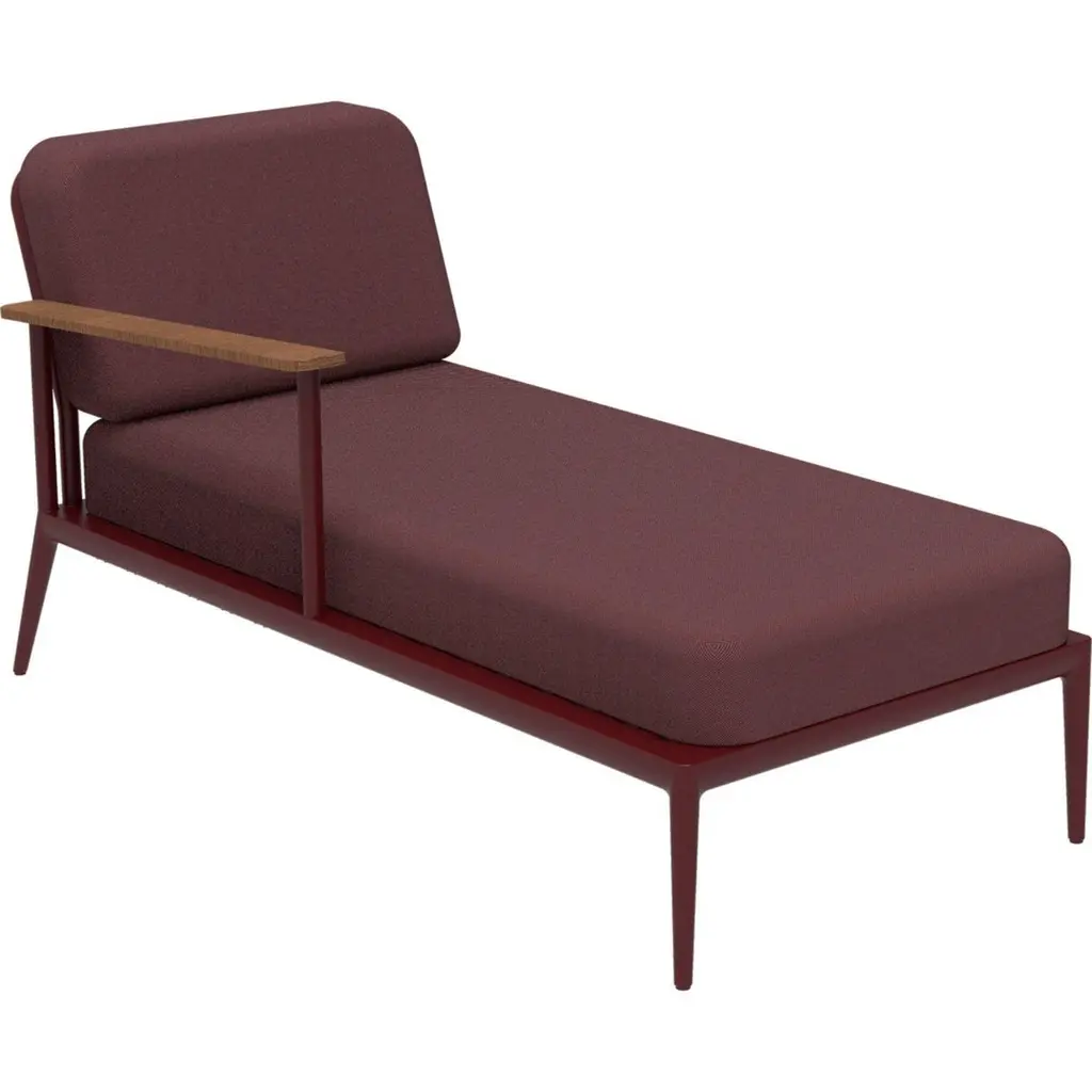 Nature burgundy right chaise longue by MOWEEDimensions: D155 x W76 x H81 cm (seat height 42 cm).Material: Aluminum, upholstery and Iroko Wood.Weight: 28 kg.Also available in different colors and finishes.An unmistakable collection for its beauty and robustness. A tribute to the Valencian manufacturing tradition as a challenge to innovation, making it sustainable and durable. A fresher version, Nature. It presents touches of natural and sustainable wood, which gives warmth and comfort, and makes it a unique collection.Möwee is part of the work, effort and commitment of Gaviota, a leading company in the outdoor sector. It was set up as an independent venture to broaden horizons in the outdoor furniture world, with its own distinctive character and way of doing things. Freshness, simplicity, quality and design are at the heart of its DNA.