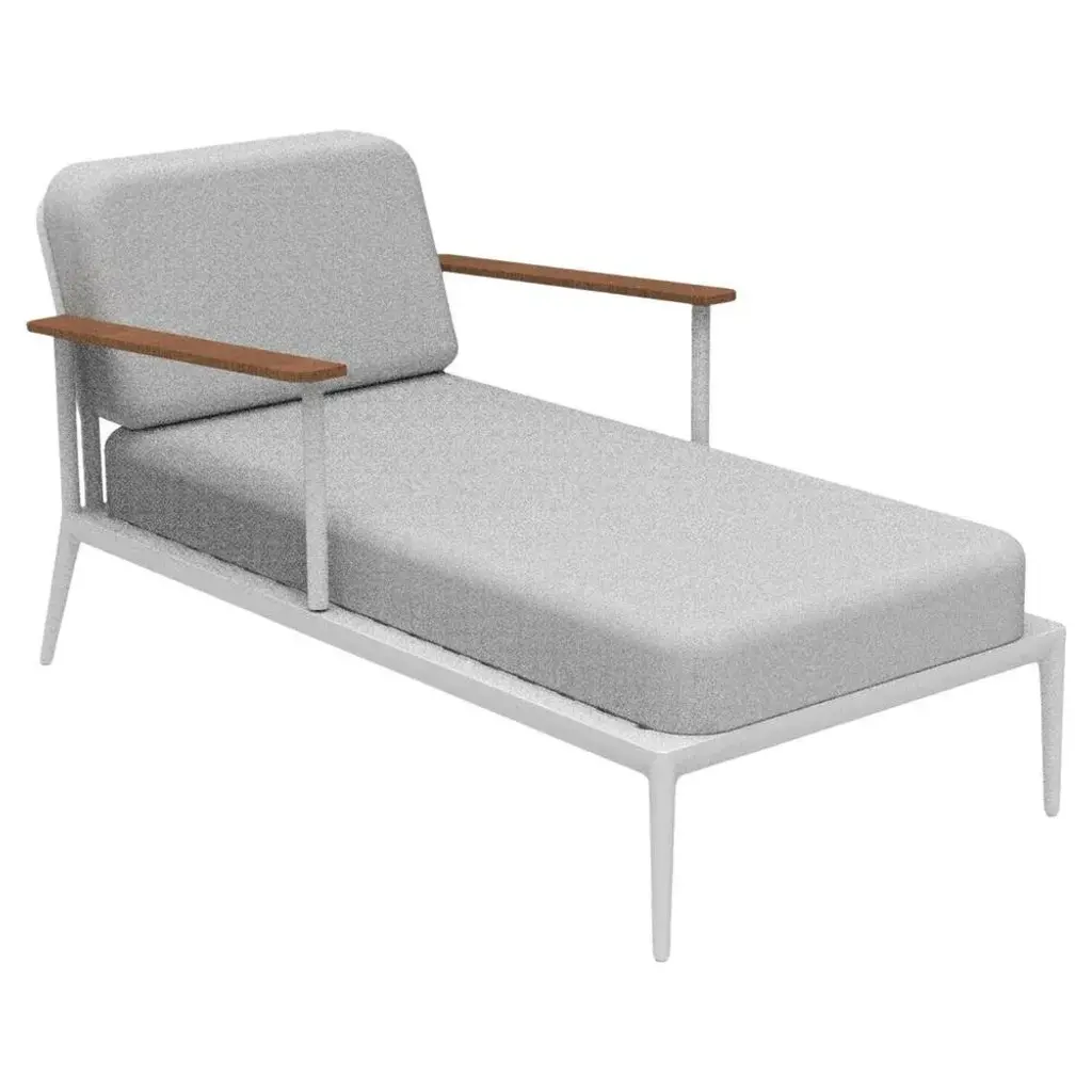 Nature white divan by mowee dimensions: d155 x w83 x h81 cm (seat height 42 cm). Material: aluminum, upholstery and iroko wood. Weight: 30 kg. Also available in different colors and finishes. An unmistakable collection for its beauty and robustness. A tribute to the valencian manufacturing tradition as a challenge to innovation, making it sustainable and durable. A fresher version, nature. It presents touches of natural and sustainable wood, which gives warmth and comfort, and makes it a unique collection.